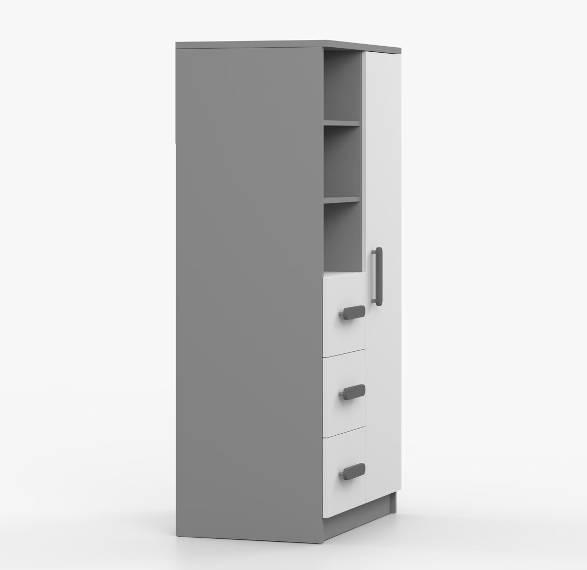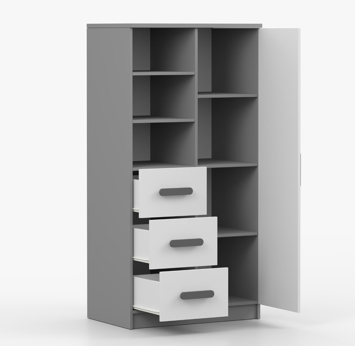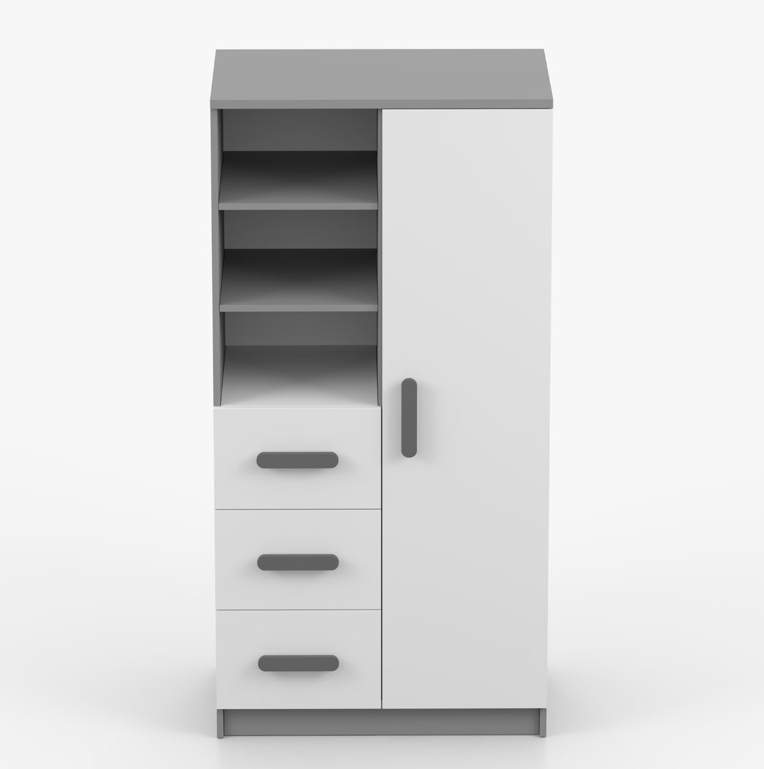 Regál SMYK nabízí praktické a všestranné úložné řešení pro každou domácnost. Je složen z dvou polic, tří prostorných zásuvek a boční skříňky s vnitřními policemi, což umožňuje dostatek prostoru pro uložení knih, oblečení a dalších věcí. Regál je vyroben z kvalitní laminované desky o tloušťce 16 mm s odolnou ABS lištou, chránící hrany regálu před mechanickým poškozením. Barevné úchytky z PVC dodávají tomuto praktickému kusu nábytku zajímavý designový prvek.