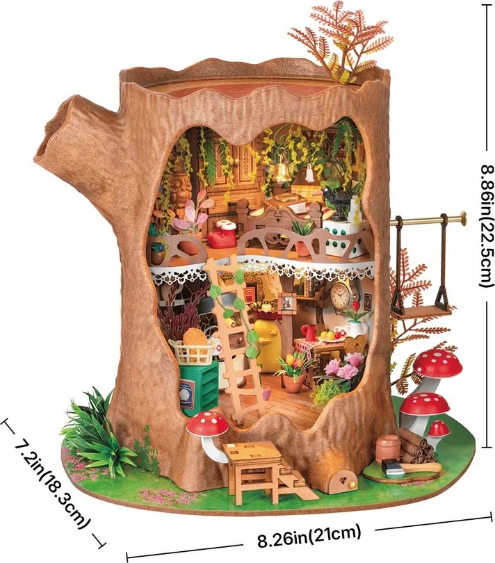 Vstupte do kouzelného lesa, kde v pevném kmeni stromu žijí drobní lesní tvorové. Příroda je jejich hřištěm a zapomenuté lidské drobnosti se v jejich rukou mění v důmyslné vybavení domova. Hluboko v lese se ukrývá malý domek ve stromě, zasazený do srdce starého pařezu. Lesní obyvatelé s neobyčejnou vynalézavostí dávají nový život ztraceným či vyhozeným předmětům lidí - hodinky bez řemínku se promění v nástěnné hodiny, kostky poslouží jako malé stolky a trychtýř se stane digestoří. Tento jednoduchý, ale útulný dvoupatrový domek má vše, co je potřeba k pohodlnému životu. Dřevěný nábytek, příjemnou ložnici, kuchyň s jídelním koutem, spotřebiče, nástěnné dekorace, květináče, houbovou zahrádku a dokonce i houpačku. Co víc si přát, když je příroda vaším sousedem a roztomilost každodenním společníkem. Postavte si tento kouzelný lesní domov, vytvořte jeho příběh a po rozsvícení LED světel proměňte svůj projekt v okouzlující expozici.Tato 3D skládačka je skvělým způsobem, jak si užít kreativní a edukativní hraní a zároveň vytvořit nádherný model s LED osvětlením, který se může stát netradičním dárkem či ozdobou interiéru. Skládání 3D skládačky podporuje rozvoj jemné motoriky, prostorového myšlení a trpělivosti. Pozvěte svou rodinu nebo přátele a užijte si zábavné tvoření bez nutnosti použití lepidla nebo nástrojů. Všechny díly skládačky jsou přesně vyřezané, a lehce do sebe zapadnou, aby výsledek byl stabilní a odolný. Je dodávána v nesloženém stavu, zabalená v krabici s podrobným návodem k sestavení a k napájení slouží 2 AAA/LR03/AM4 1,5 V (nejsou součástí balení).