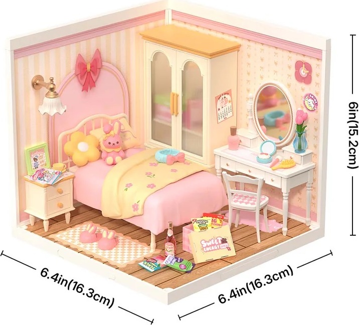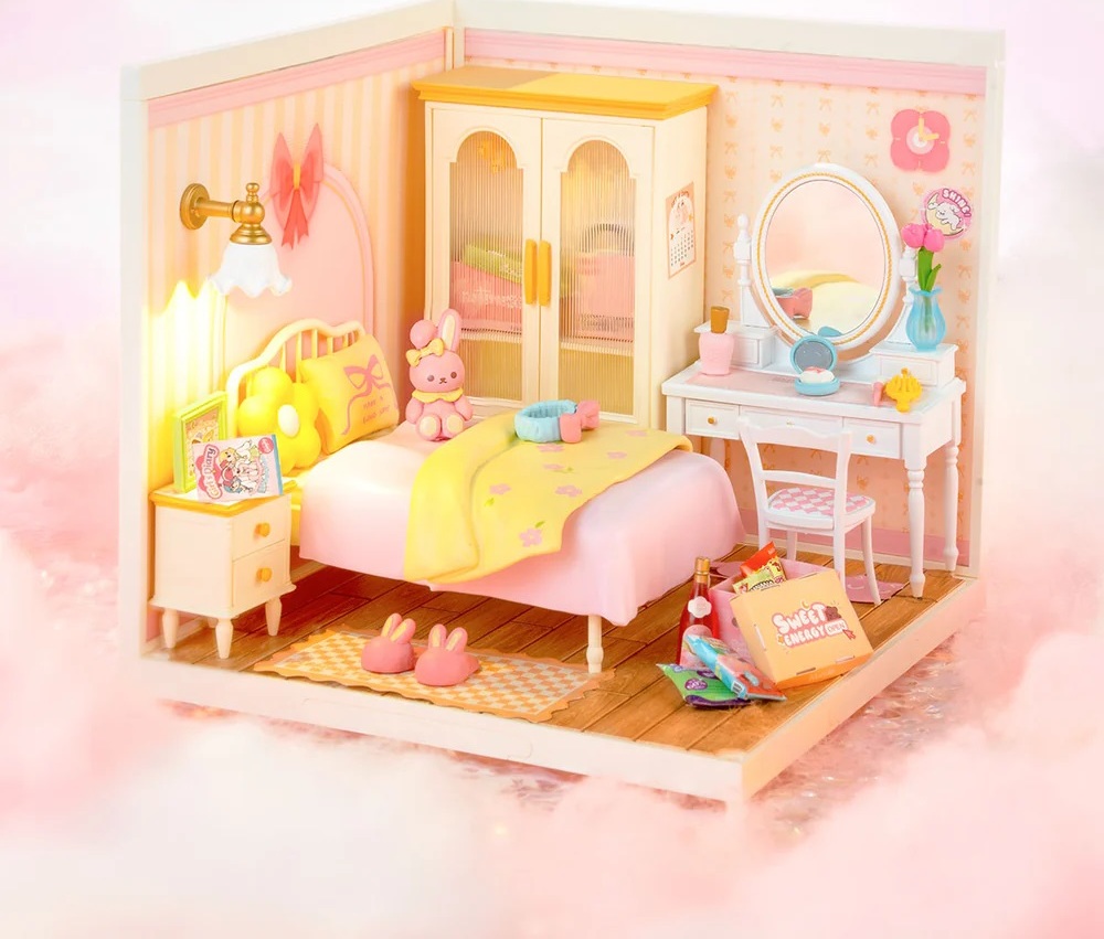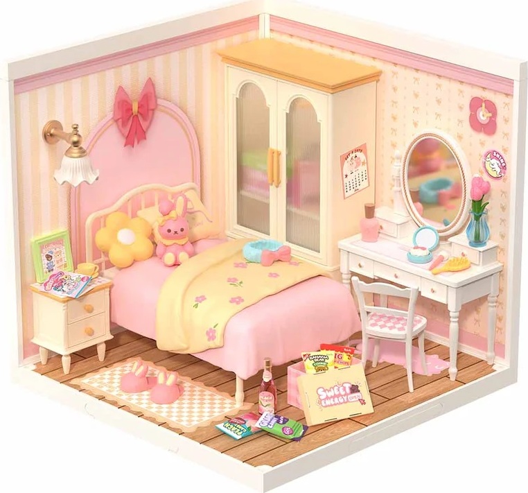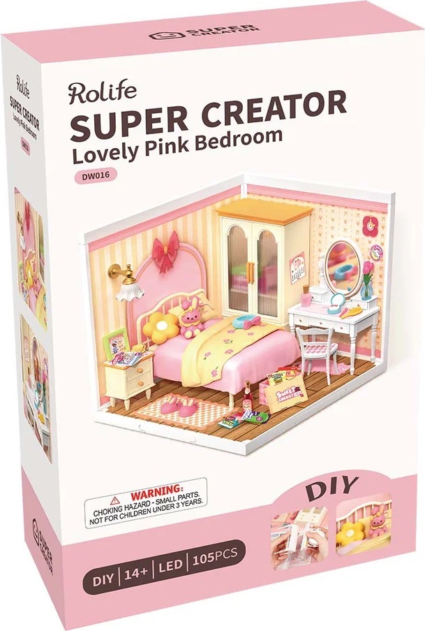 Pohodlný, stylový a jednoduchý pokojíček má vše, co si jen můžete přát! Vyrobte si vlastní krásnou růžovou ložnici, miniaturní domeček s elegantním nábytkem, jemnými růžovými akcenty a teplými žlutými slunečními tóny, které odrážejí pohodlí a štěstí. Vestavěná skříň obsahuje úhledně složené oblečení a doplňky, komoda a zrcadlo Vám umožní se upravit, malebný noční stolek ukrývá zarámovanou vzpomínku, čtecí lampička vrhá jantarovou záři a plyšový králíček sedí na posteli na polštáři ve tvaru květiny. Dokonce i podlaha je poseta útulnými detaily, jako je vzorovaný koberec, pohodlné pantofle a čokoládové pamlsky a občerstvení. Každý detail dělá z tohoto pokojíčku skutečně osobní a neodolatelný prostor, kde je možné si odpočinout, načerpat nové síly a oddat se svým koníčkům. Pojďme stavět a hrát si! Vychutnejte si atmosféru klidu a pohody, která je umocněna příjemným LED osvětlením. 3D skládačka je skvělý způsob, jak si užít kreativní a edukativní hraní a zároveň vytvořit nádherný model, který se může stát netradičním dárkem či ozdobou interiéru. Skládání 3D skládačky podporuje rozvoj jemné motoriky, prostorového myšlení a trpělivosti. Je to možnost, jak kombinovat zábavu se vzděláváním. Všechny přesně vyřezané dílky do sebe lehce zapadnou bez použití lepidla či nástrojů, aby výsledek byl stabilní a odolný. Skládačka je dodávána v nesloženém stavu, zabalená v krabici s podrobným návodem k sestavení. K napájení slouží přepínací napájecí box a kabel USB-C 5 V, který je součástí balení.