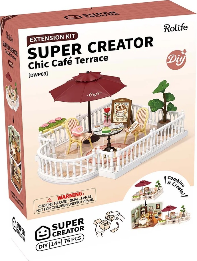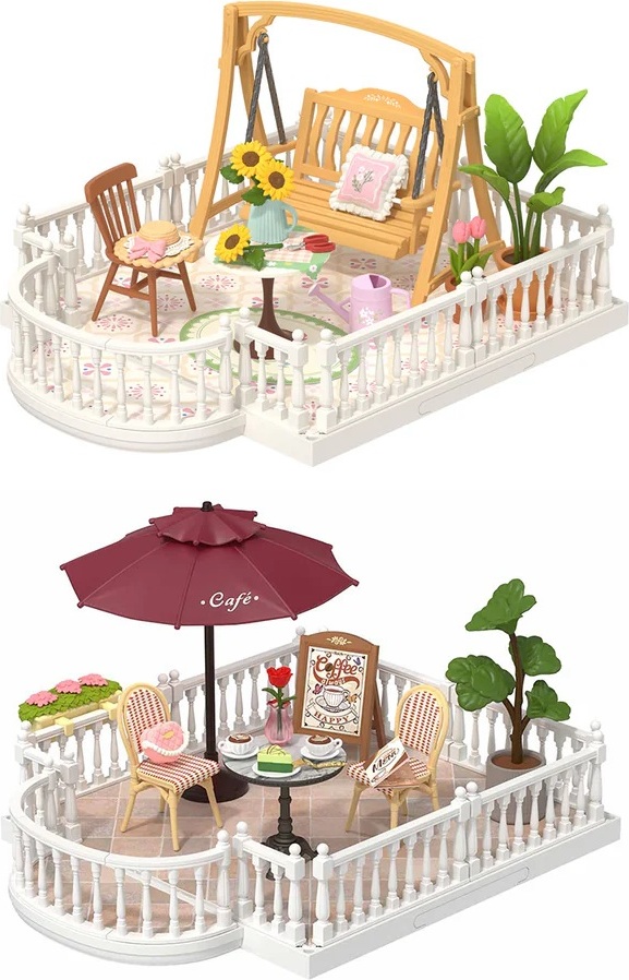Tyto 3D dřevěné skládačky jsou určeny jako rozšíření pro miniatury domečků z řady Super Creator. Stačí jí jen zacvaknout a rozšíříte tak domeček o útulný balkón, terasu nebo roztomilý koutek.