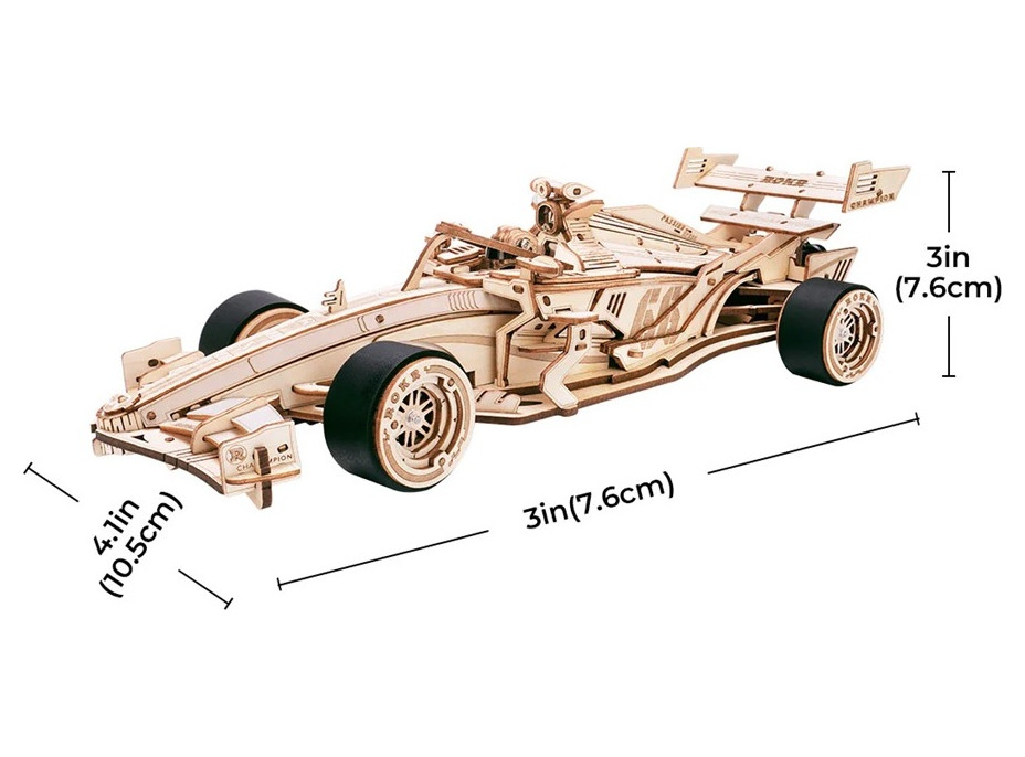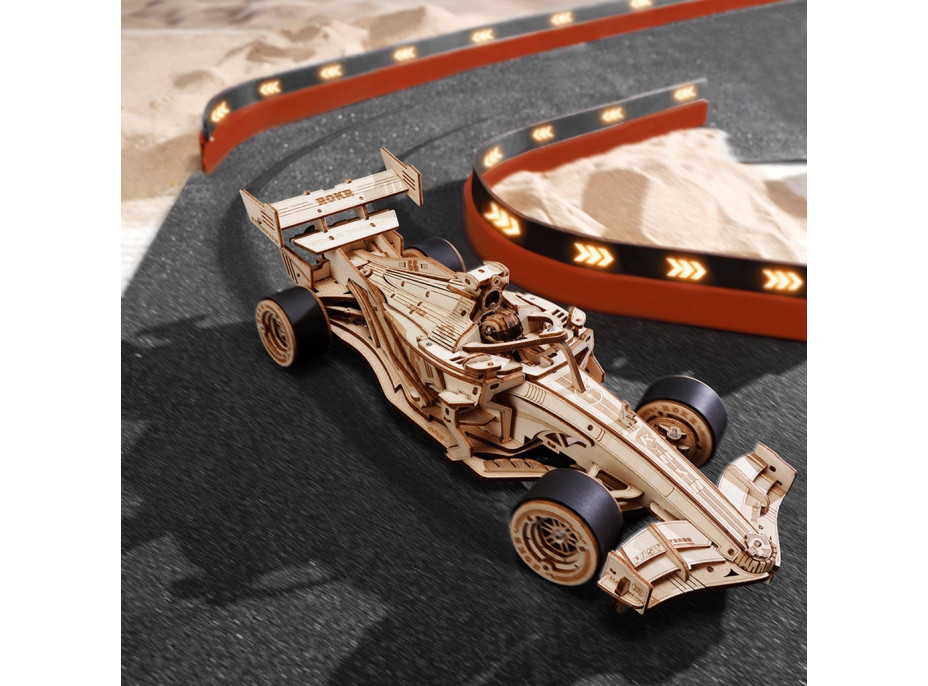 Připravte se na vzrušující jízdu na palubě závodního auta! Skládačka inspirovaná formulí F1 Vám zaručeně zvedne tlak a je ideální pro automobilové nadšence. Závodní auto má aerodynamický tvar, je realisticky propracované do nejmenších detailů, jako je dřevěný rám, zadní spoiler, špičatá příď, nízká světlá výška, kokpit s řidičem, odhalená mechanická ozubená kola a součásti motoru představující planetární převodový systém, který zajišťuje plynulé zatáčení a pohyb kol diferenciálu, zejména když se robustní silikonová kola setkají s překážkami. Převodová skříň napodobuje zvyky motoru skutečné formule F1. Toto auto nepotřebuje baterie! Stačí je natáhnout klíčem a sledovat, jak se blíží k cílové pásce. Je schopné ujet 6 až 8 metrů a poloměr otáčení činí 40 cm. Skládání 3D skládačky podporuje rozvoj jemné motoriky, prostorového myšlení a trpělivosti. Pozvěte svou rodinu nebo přátele a užijte si zábavné tvoření bez nutnosti použití lepidla nebo nástrojů. Všechny díly skládačky jsou přesně vyřezané a očíslované a lehce do sebe zapadnou, aby výsledek byl stabilní a odolný. Skládačka je dodávána v nesloženém stavu, zabalená v krabici s podrobným návodem k sestavení.
