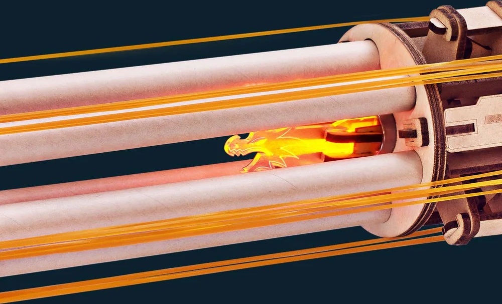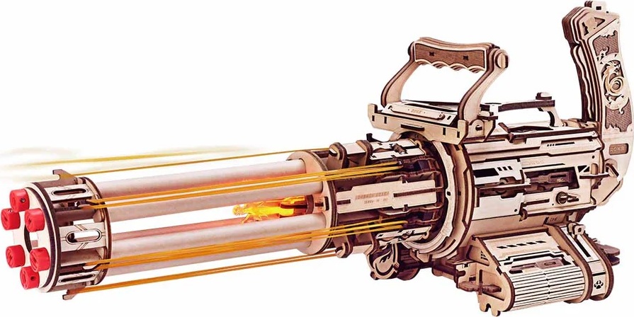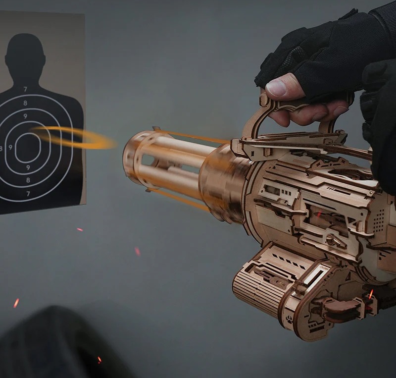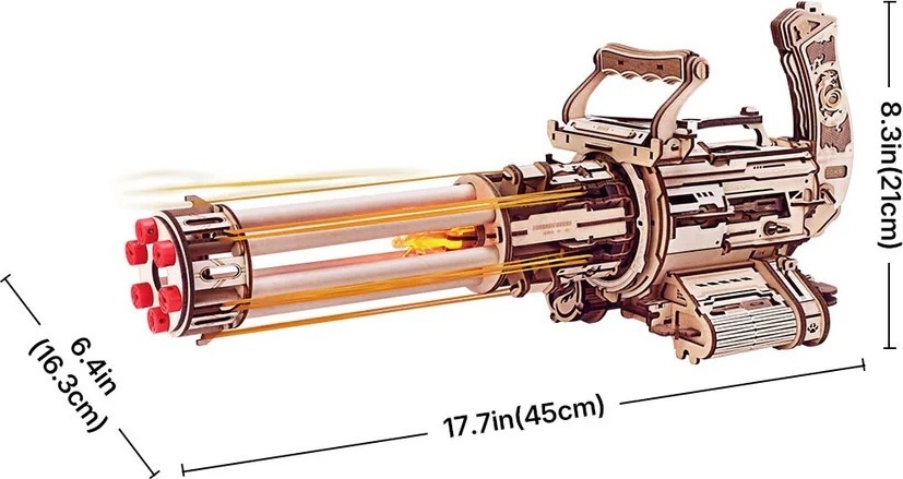 Připravit, sestavit, zaměřit, střílet! Rozprouděte si krev. Máte dostatek adrenalinu pro tuto otočnou, cvakající a střílející obouruční zbraň? Kulomet s otočnou hlavní ROKR je 3D dřevěná puzzle zbraň, jejímž vrcholem je šest otočných hlavní, z nichž každá dokáže vystřelit šest gumiček. To je 36 vysokorychlostních ran, které můžete nabít na odnímatelnou sestavu otočné hlavně. Tato kráska, inspirovaná modelem XM556, naučí fanoušky leccos o mechanice rotačních kulometů, aniž by přitom měla masivní hmotnost. Také se vyhýbá zranění živých cílů tím, že jako střely používá gumičky. Staňte se svým vlastním akčním hrdinou a objednejte si ten svůj ještě dnes! Tato stavebnice technického modelu je skvělým prvkem v jakékoli sbírce, ať už jde o vystavení nebo jako dárek pro nadšence do hraček a filmů či vojenské veterány po celém světě. Šestihlavňový kanón má jednoosý synchronizovaný systém řízení palby, který jako munici používá gumové pásy. Každá ze šesti hlavní pojme šest gumových pásů pro celkem 36 výstřelů, poháněných účinným převodovým mechanismem. Pro rovnoměrné napnutí a plynulou střelbu vkládejte munici jednu po druhé a otáčejte hlavní, dokud všechny hlavně nebudou mít 6 gumiček. Přední spoušť otáčí hlavní a světlem ohnivého draka, zatímco horní spoušť spouští gumičky pro dvojnásobnou zábavu a akci.