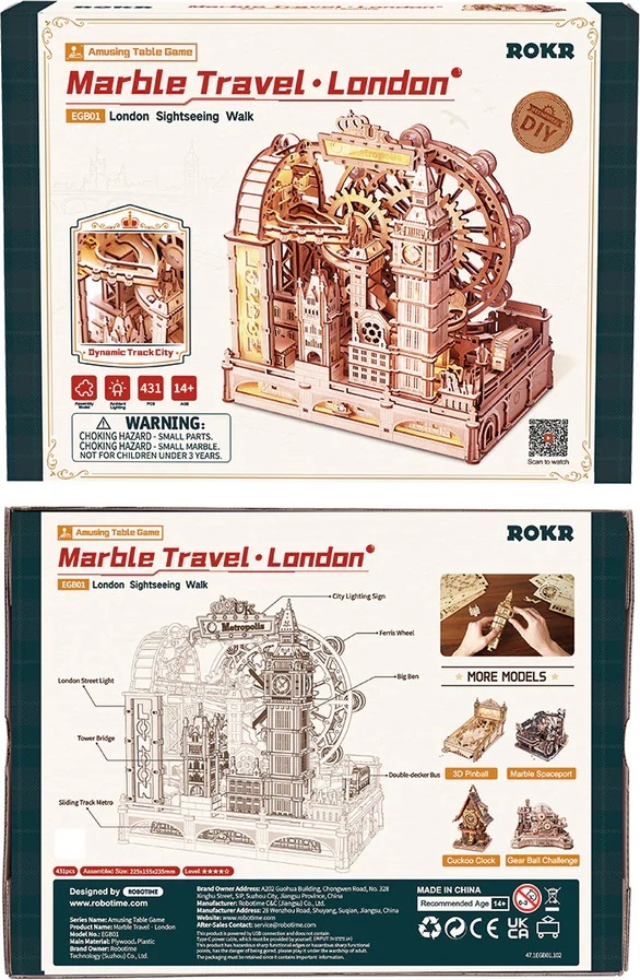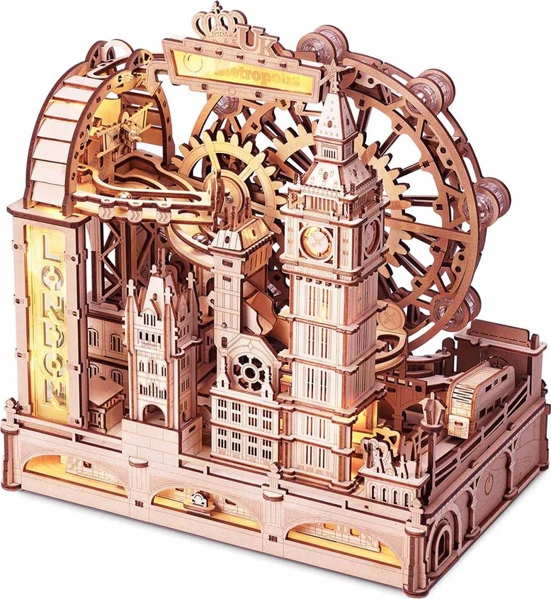 Připravte se na dynamickou prohlídku britské metropole, aniž byste museli opustit svůj pokoj, s tímto mechanickým zázrakem - 3D dřevěnou skládačkou a kuličkovou dráhou Londýn. Tento detailně zpracovaný model vás provede ikonickými londýnskými památkami díky preciznímu inženýrství a promyšlené mechanice. Během stavby i následného provozu se setkáte s miniaturami Big Benu, Tower Bridge či London Eye. Překročíte Temži, nastoupíte do dvoupatrového autobusu nebo metra a během okamžiku dorazíte do cíle, zatímco kovové kuličky sviští rampami, spirálami a tunely, poháněné kombinací gravitace a vestavěného USB-C motoru. Nechybí ani hravé detaily, včetně korunovačních klenotů, které se objeví bez rizika spuštění královského alarmu. Stavebnice obsahuje 431 precizně laserem vyřezaných dílů, které do sebe přesně zapadají a zaručují uspokojivou a obohacující stavbu. Po sestavení se model promění v plynule fungující kuličkovou dráhu, která je nejen zábavná, ale také působí jako originální mechanická dekorace. Hra je živá a nepřetržitá - na čaj se zastavíte až ve chvíli, kdy dráhu vypnete. Do té doby si můžete Londýn projet znovu a znovu, pokaždé z jiného úhlu.
