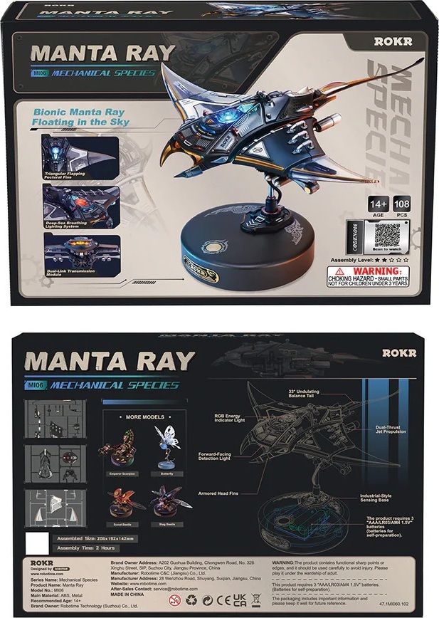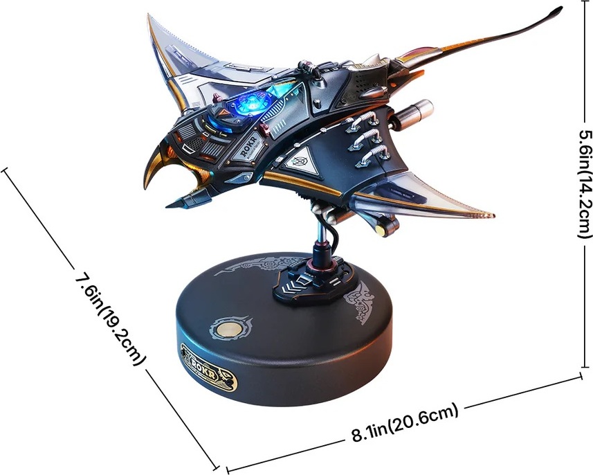 Manta rejnoka je 3D mechanické puzzle, které vás zve k tomu, abyste byli svědky tohoto fascinujícího pohybu zblízka. Tato replika manty vnese do vašeho interiéru eleganci a kouzlo mořského života. Tento miniaturní 3D model si sestavíte sami a výsledek vás okouzlí nejen pohybem, ale i světlem a atmosférou. Díky charakteristickému šípovému vzoru a plynulému pohybu ploutví model zachycuje zdánlivou beztížnou eleganci skutečné manty. Přiložený podstavec model zvedne a stiskem tlačítka se prsní ploutve začnou hladce kývat, ocas jemně kymácí a LED světla pulzují v rytmu pohybu. Druhým stiskem se spustí rychle blikající a ploutvemi zrychlující režim „Burst Mode“, který napodobuje náhlý nárůst rychlosti manty. Tento model je fascinující kombinací technické preciznosti a krásy mořského života. Skvěle se hodí jako dekorace, designový doplněk nebo originální dárek pro milovníky přírody a mechanických modelů.