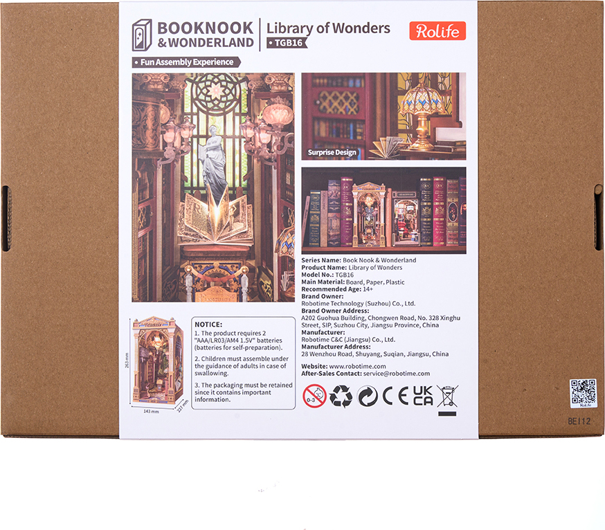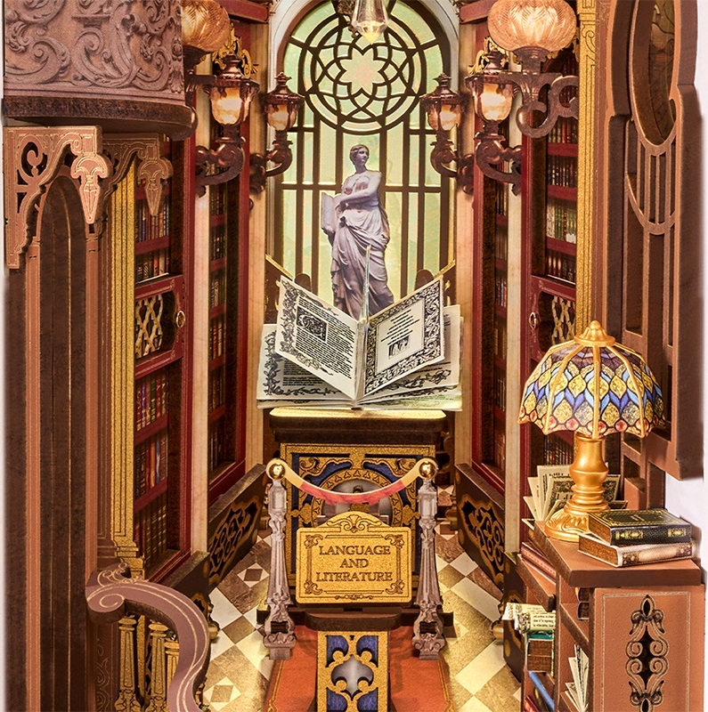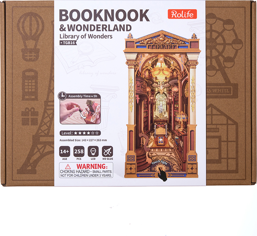 Zažijte kouzlo Knihovny divů, jedinečného knižního koutku, který vás přenese do světa goticko-viktoriánské elegance. Tento detailně propracovaný model kombinuje viktoriánskou architekturu, římské sloupy, klasické sochy, vzácné artefakty a řady starožitných knih, čímž vytváří dojem tajemného archivu bohů.Impozantní klenutá brána vás zve do prostoru plného nejen knih, ale i uměleckých detailů a bohaté výzdoby. Pod vysokým, zlatem zdobeným klenutým stropem se tyčí římské sloupy, zatímco červené dřevěné knihovny zaplňují každý kout. Balkon s výhledem na schodiště se zdobeným zábradlím je osvětlen svítícím lustrem a teplými závěsnými světly, která dodávají scéně útulnou atmosféru. Na vzdáleném konci haly se nacházejí klenutá okna s jemnou kružbou a uprostřed prostoru stojí mahagonový pult s otevřenou knihou plnou kaligrafie. Čtenářský koutek je zakončen střechou ve viktoriánském stylu a bočními panely inspirovanými pevnou knižní vazbou, které plynule navazují na okolní knihovny. Knihovna divů je ideální dekorací pro milovníky knih, historie a kreativního tvoření - okouzlující detail, který promění každou knihovnu v malé umělecké dílo. 3D skládačka je skvělý způsob, jak si užít kreativní a edukativní hraní a zároveň vytvořit nádherný model, který se může stát netradičním dárkem či ozdobou interiéru. Skládání 3D skládačky podporuje rozvoj jemné motoriky, prostorového myšlení a trpělivosti. Je to možnost, jak kombinovat zábavu se vzděláváním. Všechny přesně vyřezané dílky do sebe lehce zapadnou bez použití lepidla či nástrojů, aby výsledek byl stabilní a odolný. Skládačka je dodávána v nesloženém stavu, zabalená v krabici s podrobným návodem k sestavení. K napájení slouží 2x AAA /LR03/AM4 1,5 V (nejsou součástí balení).