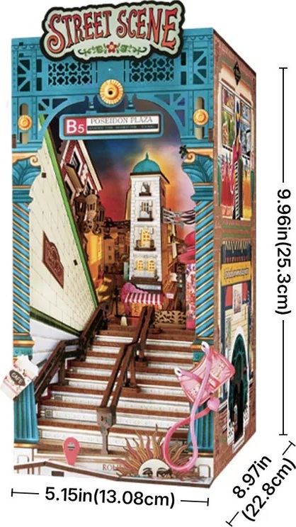 Proměňte svou polici v rušnou městskou ulici. Scéna vyzařuje městskou atmosféru, úzké schody ihned upoutají pozornost a nahoře se otevírá výhled na osvětlené domy, pouliční lampy, dlažbu a jemné detaily chodníků. Spodní část schodiště doplňují drobnosti každodenního života, včetně papírováho kelímku od kávy, růžové crossbody kabelky, které naznačují každodenní rutinu dojíždějících. Pro milovníky cestování a atmosféry města je zde stylizovaný sluneční ciferník a ikona s mapou - připomínka dobrodružství v nové lokalitě. Nepřehlédnutelným překvapením je malé „nádraží“ skryté pod schody a umístěné po straně knihkupectví - objev, který potěší pokaždé, když vložku vytáhnete. Celkový dojem završuje LED osvětlení, které dokáže proměnit scénu ve zlatavý západ slunce nebo pulsující noční město.3D skládačka je skvělý způsob, jak si užít kreativní a edukativní hraní a zároveň vytvořit nádherný model, který se může stát netradičním dárkem či ozdobou interiéru. Skládání 3D skládačky podporuje rozvoj jemné motoriky, prostorového myšlení a trpělivosti. Je to možnost, jak kombinovat zábavu se vzděláváním. Všechny přesně vyřezané dílky do sebe lehce zapadnou bez použití lepidla či nástrojů, aby výsledek byl stabilní a odolný. Skládačka je dodávána v nesloženém stavu, zabalená v krabici s podrobným návodem k sestavení. K napájení slouží 2x AAA /LR03/AM4 1,5 V (nejsou součástí balení).