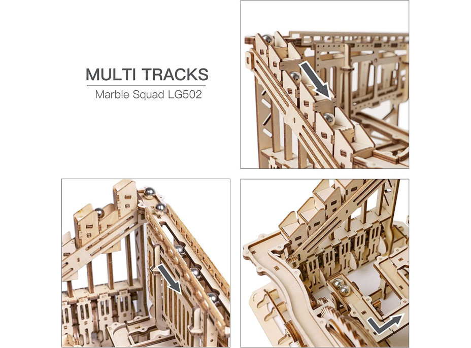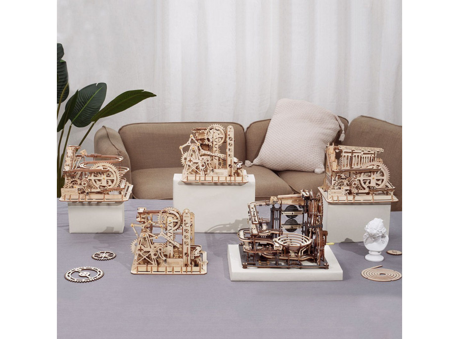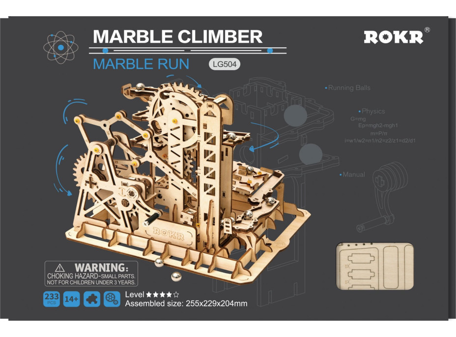 Kuličková dráha Robotime-ROKR Marble Run Race je založena na skvělém lidském inženýrství. Spojuje v sobě krásu vědy a strojů a zahrnuje spoustu malých přístrojů. Sestavte sadu, zatočte klikou a sledujte, jak se kuličky bláznivě kutálejí po drahách a klopených zatáčkách. Ručně vyrobená kuličková dráha s centrální pevností. Skládá se z věžového rozdělovače, spirálových svahů, jeřábového zvedáku, kolového zvedáku, krátké skluzavky a malých spínačů. Složitý systém ozubených kol, převodů a koleček plný bláznivých zákrut. Naučte se principy vědy, techniky, inženýrství a matematiky (STEM). Přesně vyřezané dílky laserem. Kvalitní, bezpečné a netoxické materiály. Rozvíjí technické myšlení, představivost, cit pro detail a jemnou motoriku. Skvělý dárek pro rodinu a přátele ke všem příležitostem. Obtížnost: 4 z 5 (dle rozdělení Robotime). Orientační doba na složení: 6-7 hodin. Balení obsahuje: 7 předřezaných dřevěných listů, hřídelové objímky, ocelové kuličky, brusný papír, voskovou tyčinku, matičky, rukojeť, ocelové hřídele, obrázkový návod s texty v angličtině a QR kódem pro zobrazení videa. Rozměr složeného puzzle cca 25,2 x 22,7 x 20,3 cmVlastnosti