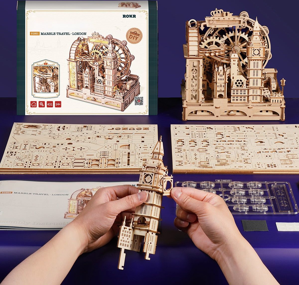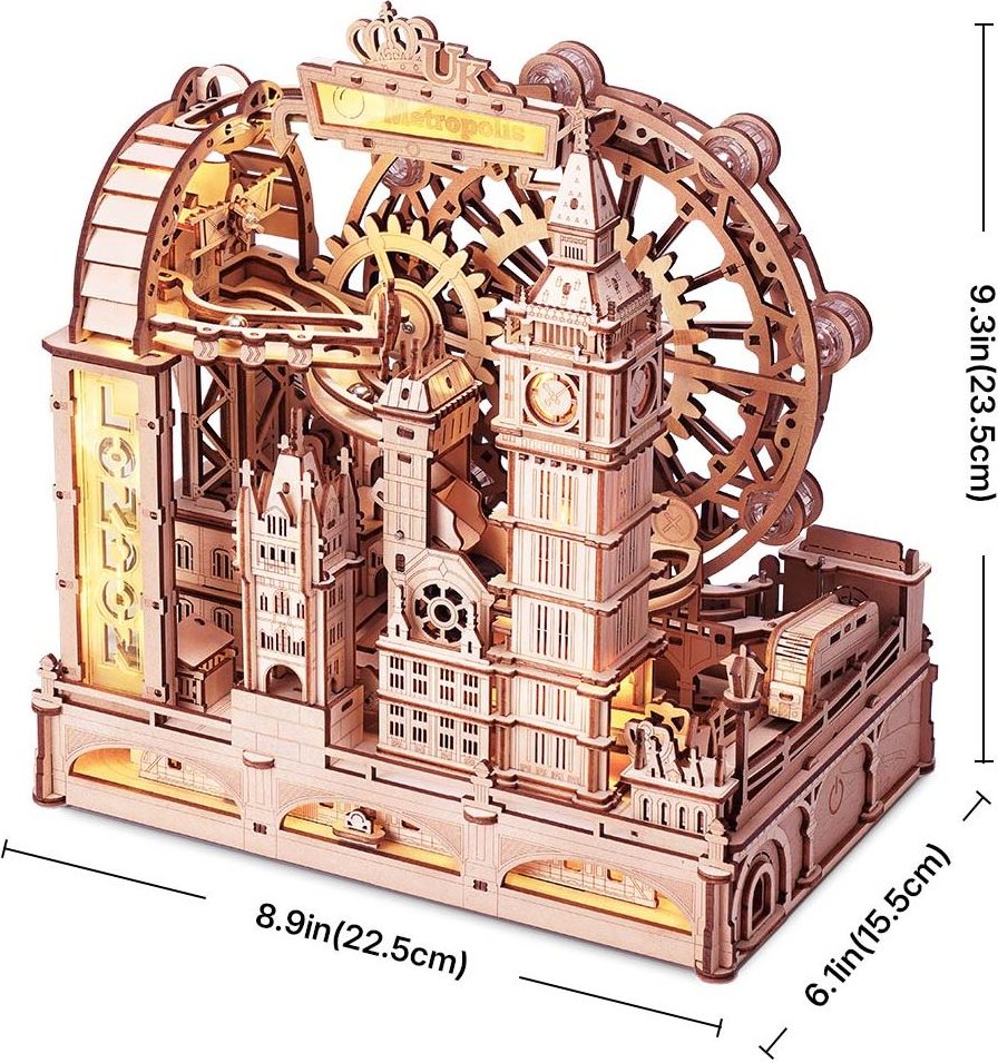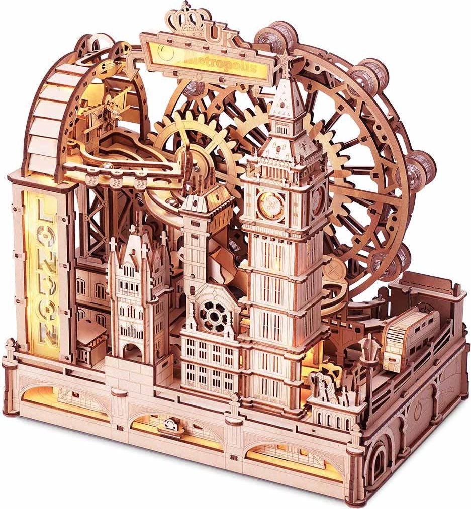 Postavte si slavné londýnské památky. S pomocí precizního inženýrství a detailních miniatur Big Benu, Tower Bridge a Londýnského oka se vydáte přes Temži, nasednete na červený patrový autobus nebo do metra, zatímco kovové kuličky sviští po rampách a tunelech díky gravitaci a výkonnému motoru. Nechybí ani symbolické Korunovační klenoty – samozřejmě bez spuštění královského poplachu.