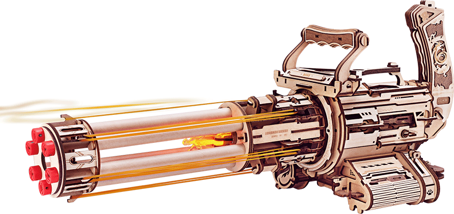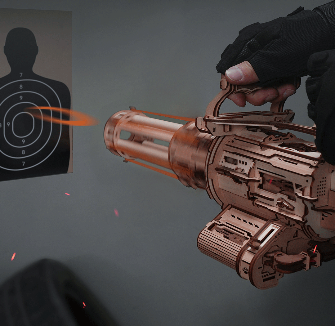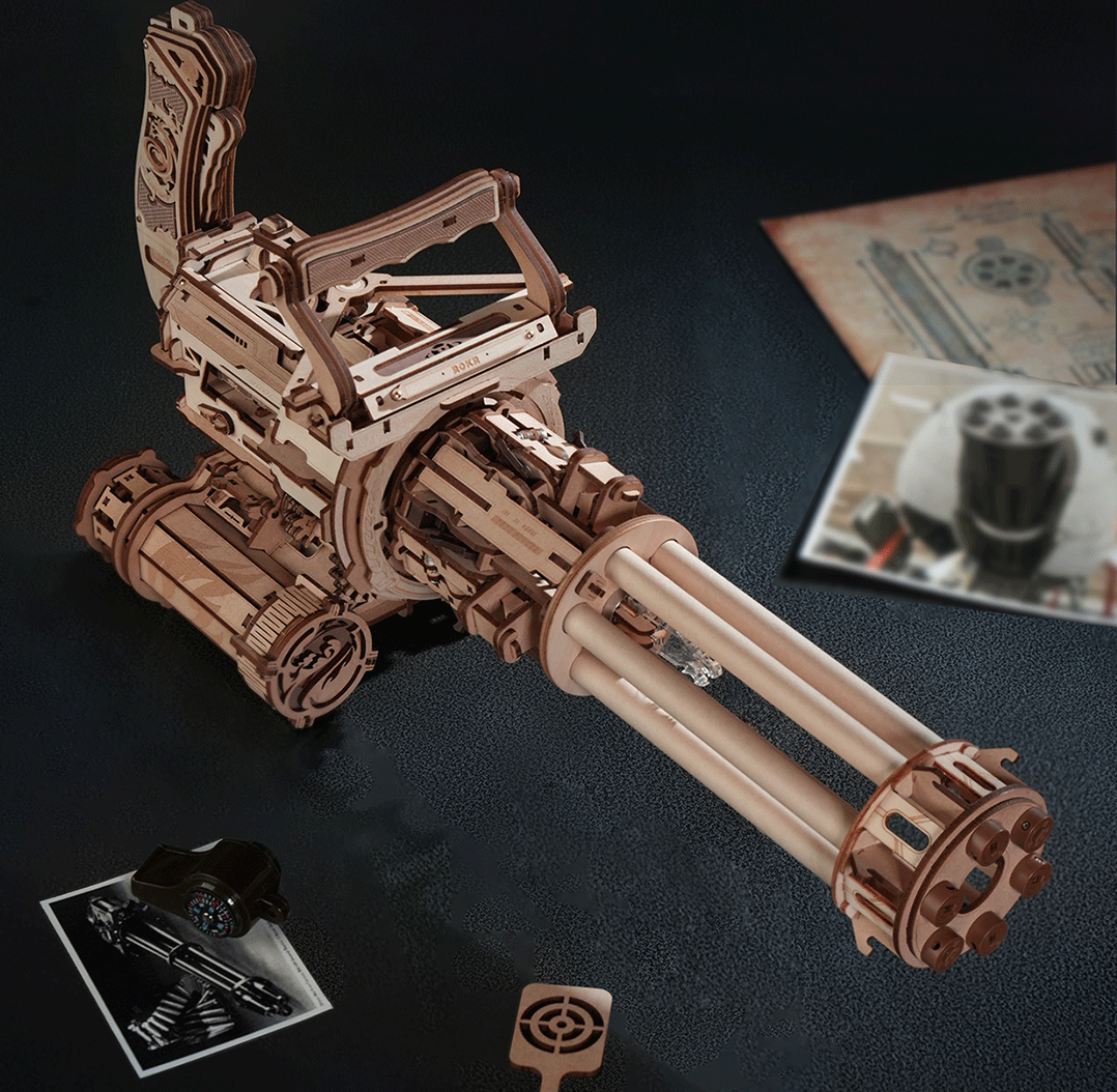 dřevěná puzzle zbraň, jejíž hlavní předností je šest rotujících hlavní, z nichž každá může vystřelit šest gumiček.Laserem předřezané dílky z kvalitní lipové překližky pro stavbu svépomocí. Celkem 36 rychlých výstřelů, které můžete nabít do odnímatelného rotačního modulu. Model inspirovaný XM556 naučí fanoušky něco o mechanice rotačních kulometů, aniž by měl jejich obrovskou hmotnost. Zároveň nehrozí zranění živých cílů, protože jako náboje používá gumičky.