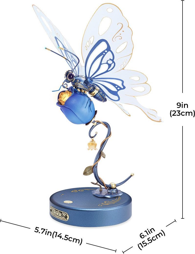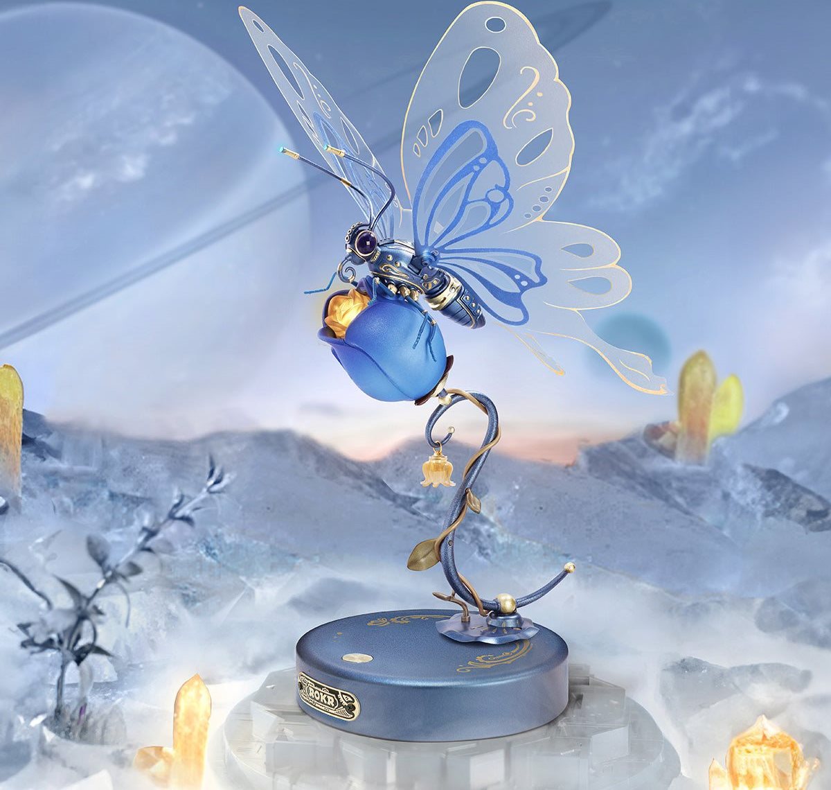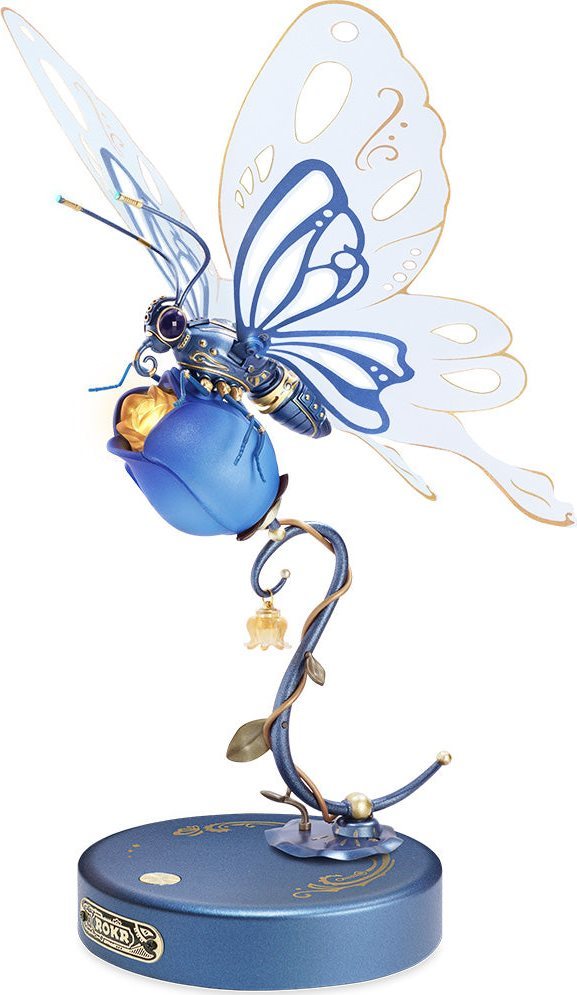 3D model ze série ROBOTIME Rokr Mechanical. Záhadný motýl prošel kouzelnou mechanickou evolucí - jeho mechanizované tělo přináší nejen krásu, ale i nové výzvy a obtíže. Příroda je plná tajemné krásy – a ROKR nyní obrací svou pozornost ke světlým, lehkým motýlům a přináší vám nový mechanický druh. Tělo motýla je pevně zpracováno z odolného materiálu ABS, zatímco jeho třpytivá měkká křídla jsou z pružného PVC. Speciální tisková metoda přidává elegantní šampaňské vzory a na jeho zádech září třpytivý drahokam, který se leskne na slunci. Motýl přistává na květu růže s jemnými úponky. Položte motýla na základnu, zapněte jej a jemně se ho dotkněte – uvidíte, jak mu začnou mávat křídla. Jak se mění frekvence mávání, růže i jeho tykadla se jemně rozsvěcují, jako by dýchaly a ožívaly – a ve slunečním světle se celá scéna nádherně třpytí.