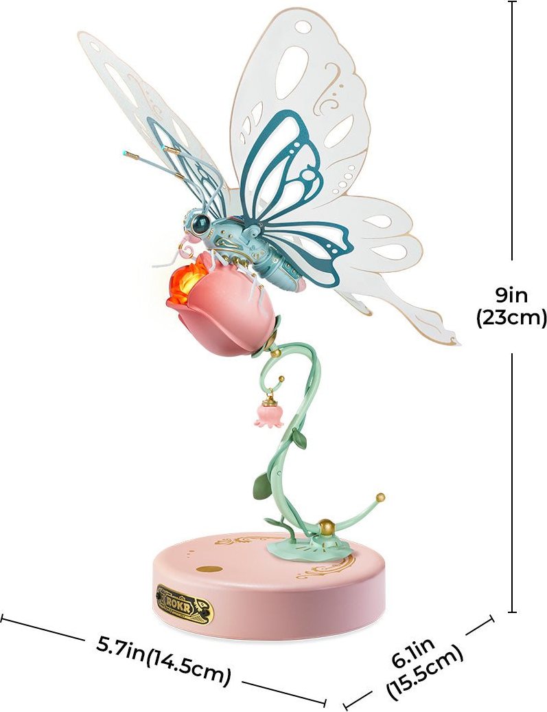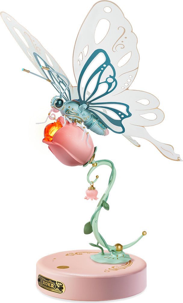 3D model ze série ROBOTIME Rokr Mechanical. Záhadný motýl prošel kouzelnou mechanickou evolucí - jeho mechanizované tělo přináší nejen krásu, ale i nové výzvy a obtíže. Příroda je plná tajemné krásy – a ROKR nyní obrací svou pozornost ke světlým, lehkým motýlům a přináší vám nový mechanický druh. Tělo motýla je pevně zpracováno z odolného materiálu ABS, zatímco jeho třpytivá měkká křídla jsou z pružného PVC. Speciální tisková metoda přidává elegantní šampaňské vzory a na jeho zádech září třpytivý drahokam, který se leskne na slunci. Motýl přistává na květu růže s jemnými úponky. Položte motýla na základnu, zapněte jej a jemně se ho dotkněte – uvidíte, jak mu začnou mávat křídla. Jak se mění frekvence mávání, růže i jeho tykadla se jemně rozsvěcují, jako by dýchaly a ožívaly – a ve slunečním světle se celá scéna nádherně třpytí.