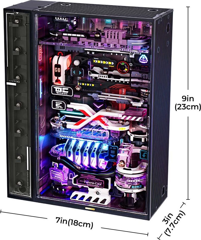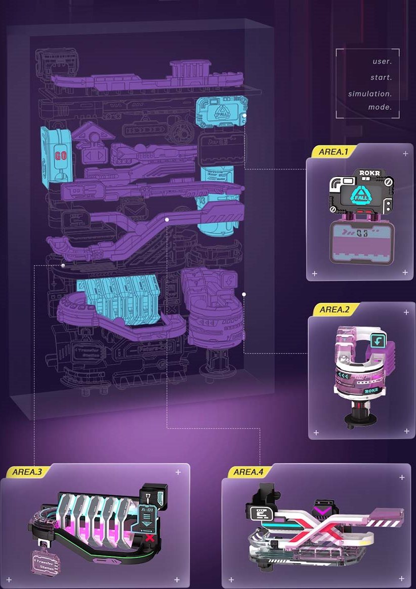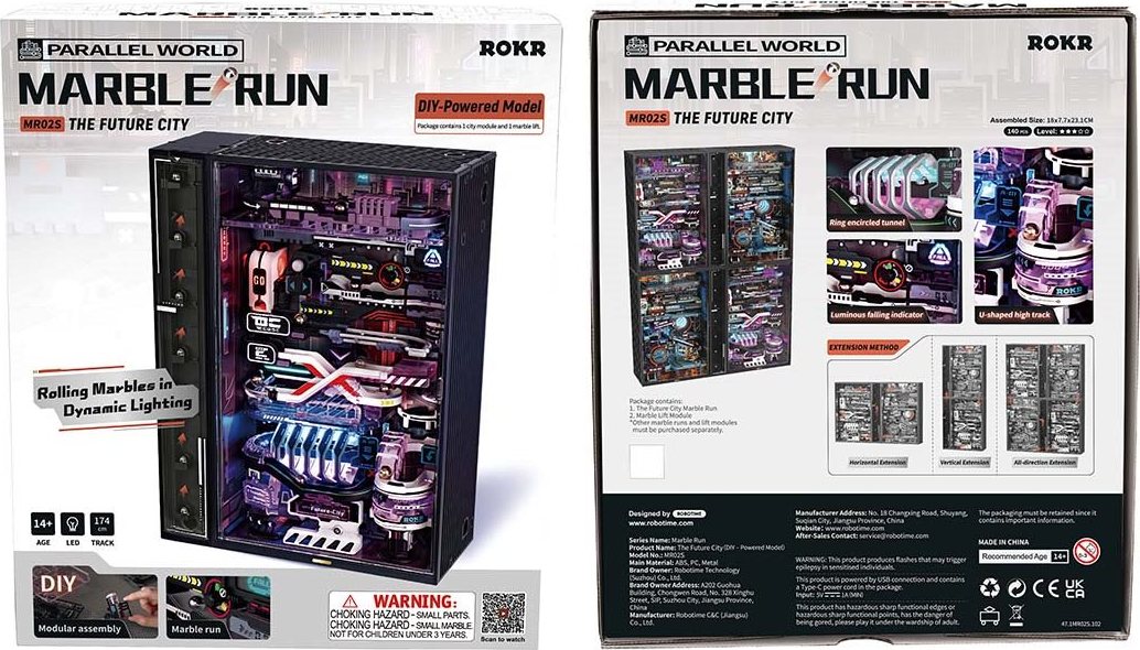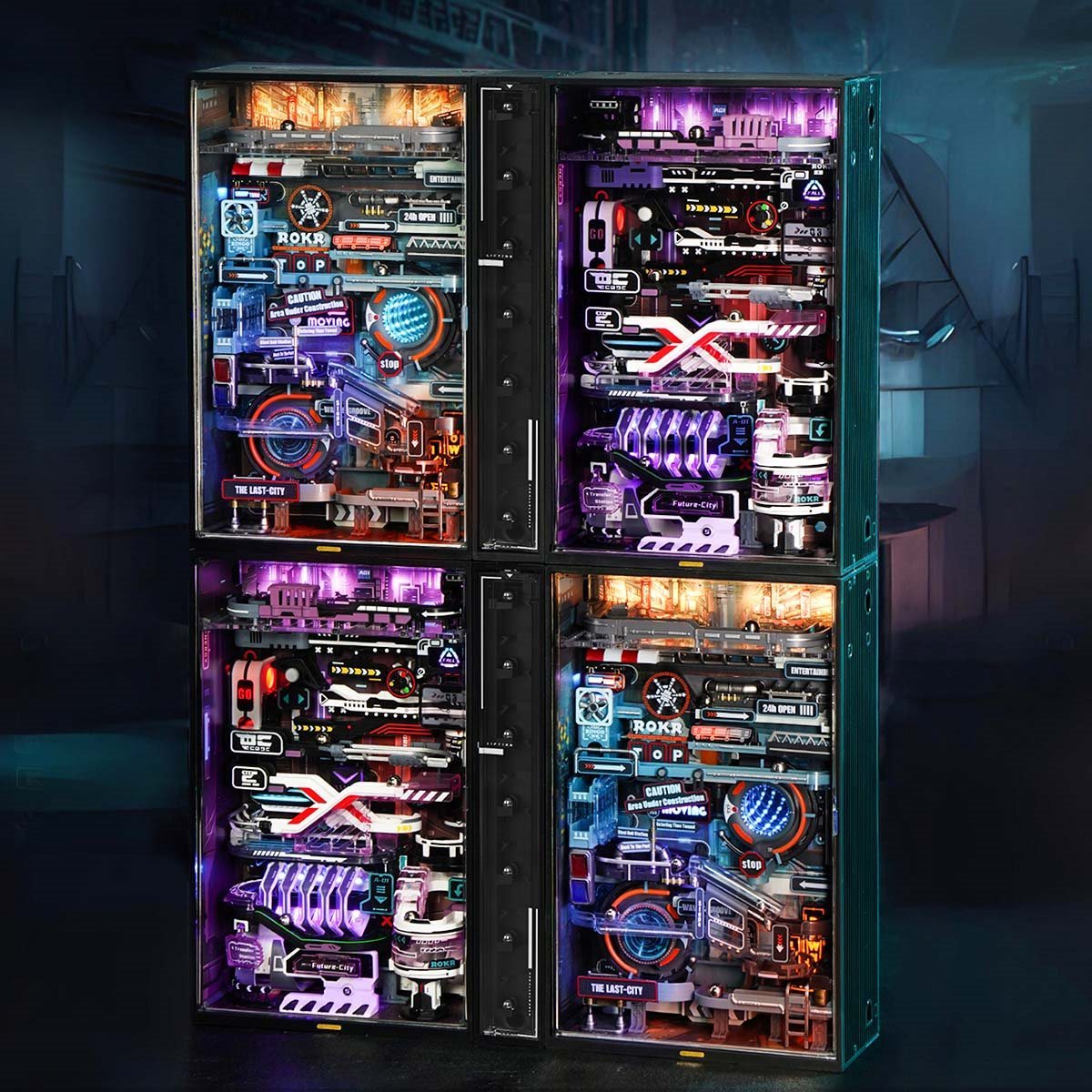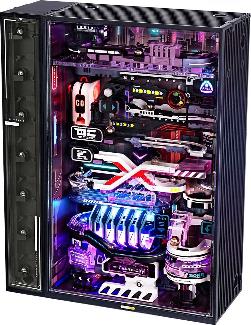 3D model ze série ROBOTIME Rokr Mechanical. Vítejte v jedinečné, futuristické a městské krajině. Tento paralelní svět se odehrává ve vesmíru industriálního steampunku a neonových světel. Mrakodrapy se tyčí na pozadí potrubí, továren a ostrých zatáček, které jsou svědky zběsilého závodu několika rychlých kuliček.