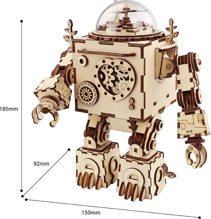 3D dřevěný model hrací skříňky ve tvaru robota se svítícím srdcem. Robota můžete naaranžovat do různých pozic - může stát, sedět, zvednout ruce. Detailně provedená hudební skříňka ve stampunkovém stylu. Při přehrávání skladby Orpheus se otáčí vrtule umístěná v prostoru hlavy robota. Samostatně ovládané LED světlo v místě srdce. Zábavné skládání s kouzlem mechanických převodů. Laserem předřezané dílky z kvalitní lipové překližky pro stavbu svépomocí. Rozvíjí technické myšlení, představivost, cit pro detail a jemnou motoriku. Přehledný obrázkový návod krok za krokem, včetně QR kódů pro zobrazení videonávodu. Překrásný dárek pro větší děti i dospělé, elegantní dekorace. Obtížnost: 4 ze 5 (dle rozdělení Robotime). Pro provoz LED světla je třeba 3 ks 1,5V baterie LR41(součástí balení). Rozměr složeného puzzle cca 15 x 9,2 x 18,5 cmVlastnosti