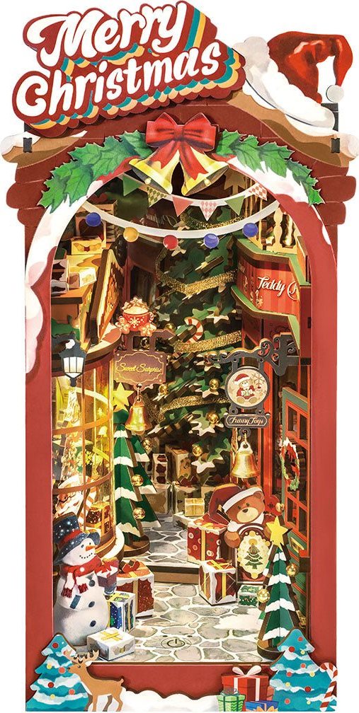Řada ROBOTIME ROLIFE 3D Book Nook Do It Yourself Miniature House představuje miniaturní domečky jako zarážku na knihy ve formě zmenšených modelů místností, pokojů, domů, uliček i zahrádek. Vlastníma rukama vykouzlíte úžasná díla s desítkami miniaturních detailů. Užijte si hodiny tvoření a těšte se překrásným výsledkem. Už jste někdy s nadšením hledali ten perfektní vánoční dárek – hnaní radostí najít pro své blízké něco opravdu výjimečného? Představte si, jak kráčíte po dlážděné uličce lemované zasněženými stromy, nakukujete do výloh plných barevných balíčků a rozmýšlíte se, zda začít hravým obchodem Funny Toys, nebo sáhnout po něčem dojemném z Sweet Surprise. Okouzlí každého diváka třpytivými světýlky, vánoční výzdobou, zářivě zabalenými dárky a oblíbenými postavičkami, jako je Santa Claus, sněhulák nebo plyšový medvídek.