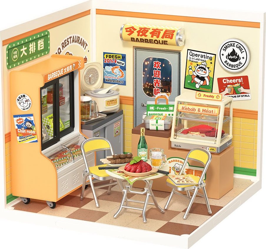 Užijte si večer s přáteli a rodinou nonstop otevřené restauraci – místa, kde si můžete vybrat své oblíbené barbecue, omáčky i nápoje přesně podle chuti. Vyberte si dobroty z lednice, počkejte, až budou krásně horké a připravené k jídlu, naberte si čerstvě uvařenou rýži přímo z rýžovaru, a vytvořte si vlastní dip z nabídky dochucovadel. A co nápoje? Čekají na vás láhve oblíbených drinků i neomezený ledový čaj připravený k nalití. Tento typ nočního pivního a barbecue stánku, populární v Japonsku, Koreji a především v Číně, je dokonale ztvárněn v tomto detailním DIY domečku. Nechybí posezení, ikonické nápisy, lednice, grilovací pult ani další realistické prvky. Celý prostor je veselý, barevný, moderní a do posledního kousku propracovaný.