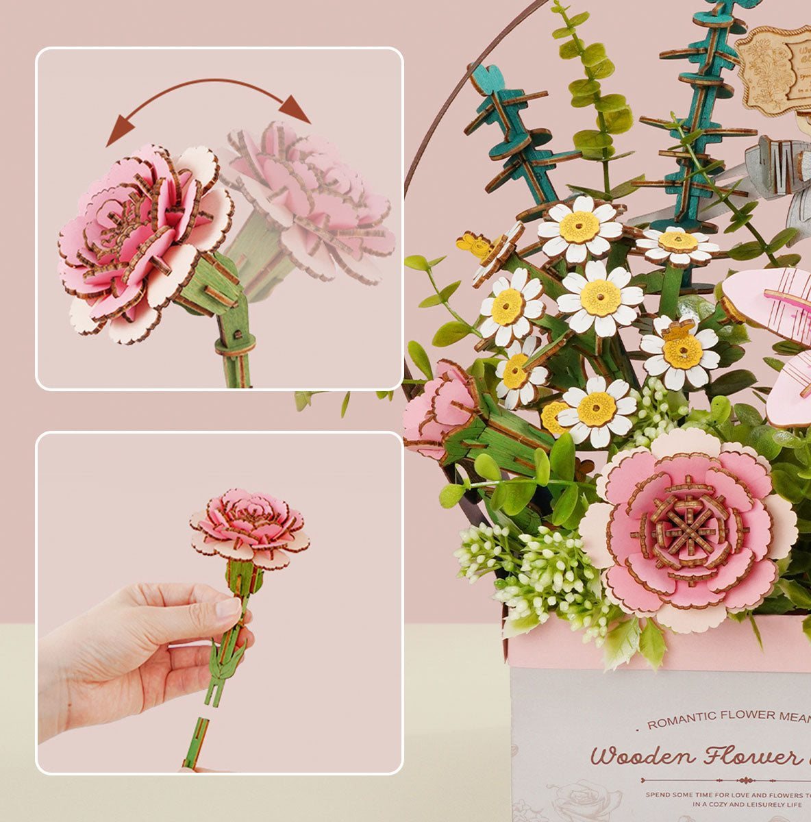 Poskládejte si vlastní 3D dřevěné květiny. Skládání 3D modelů podporuje rozvoj jemné motoriky, prostorového myšlení a trpělivosti. Pozvěte svou rodinu nebo přátele a užijte si zábavné tvoření bez nutnosti použití lepidla nebo nástrojů. Všechny díly skládačky jsou přesně vyřezané a očíslované a lehce do sebe zapadnou, aby výsledek byl stabilní a odolný. Skládačka je dodávána v nesloženém stavu s obrázkovým návodem k sestavení.