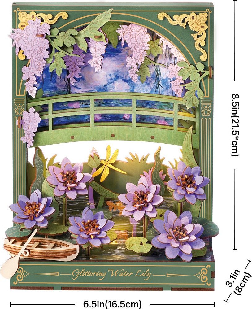 Poskládejte si vlastní 3D dřevěné květiny. Lekníny od Rowood, ztvárněné podle klasických obrazů Clauda Moneta, jsou květiny, které nikdy nezvadnou. Jsou zároveň noční lampičkou i dekorací. Několik složitě vrstvených květů rozkvétají napříč jezírkem spolu s dřevěnou loďkou pod obloukovým zahradním mostem.