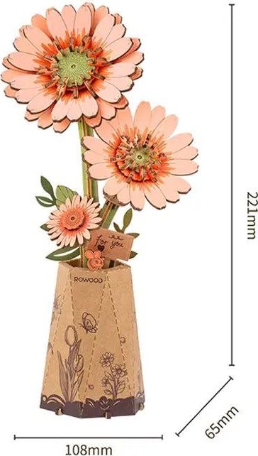 Poskládejte si vlastní 3D dřevěnou květinu. Skládání 3D modelů podporuje rozvoj jemné motoriky, prostorového myšlení a trpělivosti. Pozvěte svou rodinu nebo přátele a užijte si zábavné tvoření bez nutnosti použití lepidla nebo nástrojů. Všechny díly skládačky jsou přesně vyřezané a očíslované a lehce do sebe zapadnou, aby výsledek byl stabilní a odolný. Skládačka je dodávána v nesloženém stavu s obrázkovým návodem k sestavení. Z jednotlivých květin (prodáváno samostatně) si lze poskládat větší kytici.