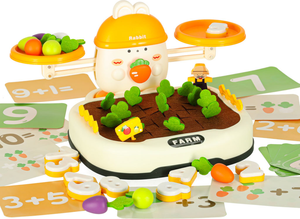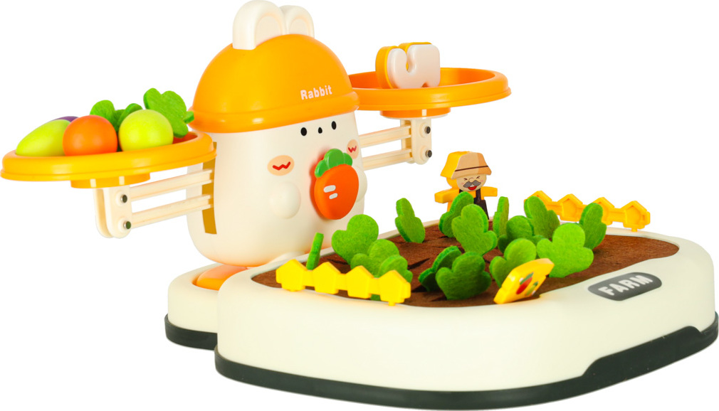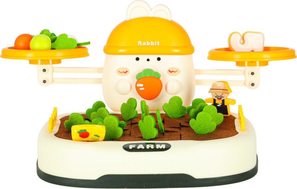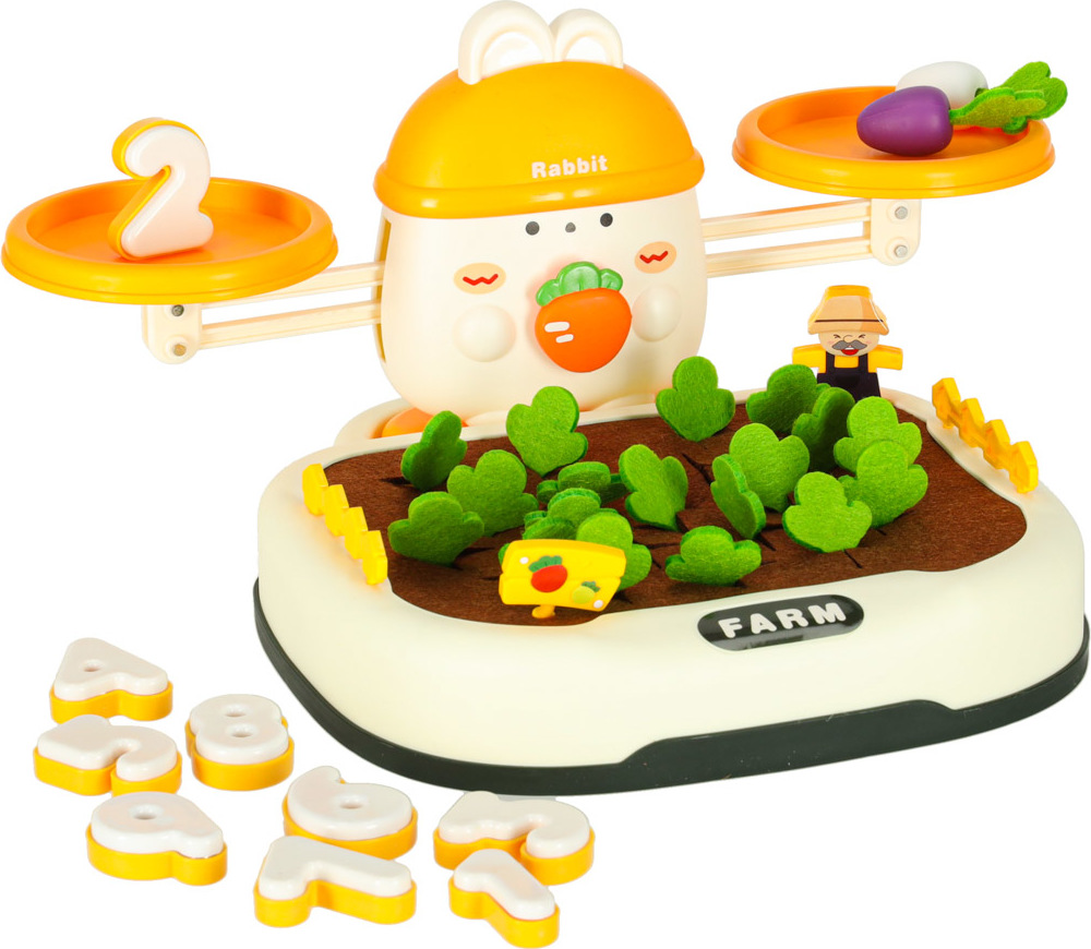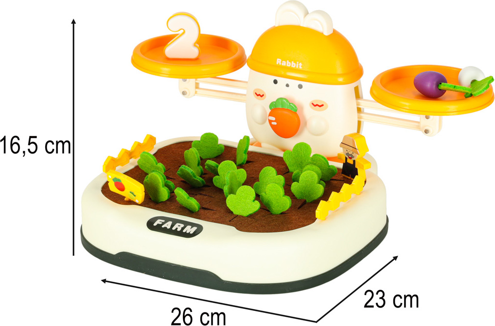 Rozkošný králíček kraluje v horní části sady a "hlídá" rovnováhu. Dítě může naskládat mrkev nebo jiné předměty ve snaze udržet rovnováhu nebo ji záměrně narušit, přičemž se učí základům fyziky a logického myšlení. Sada je také vybavena speciálními čísly - každé číslo má příslušnou váhu odpovídající číslu, které představuje. To umožňuje batoleti experimentovat, porovnávat váhy a učit se číselné hodnoty v praxi! Tato hra je skvělá pro podporu učení počítání a základních matematických pojmů.
