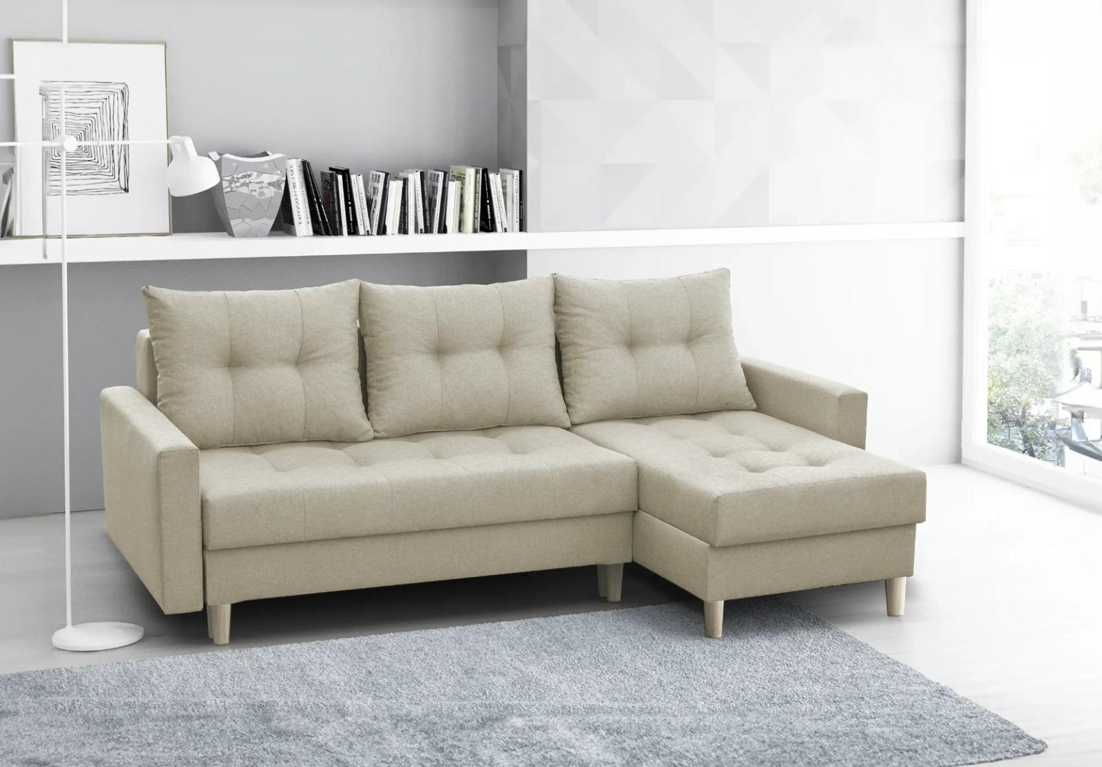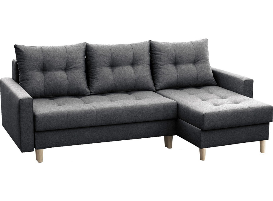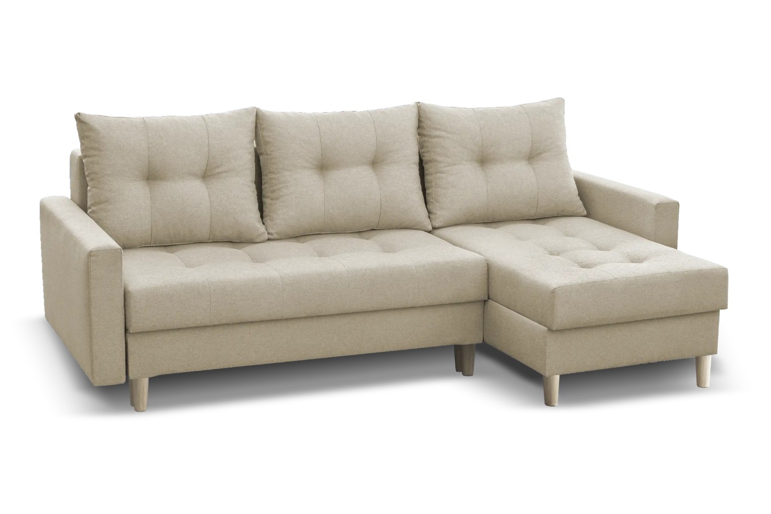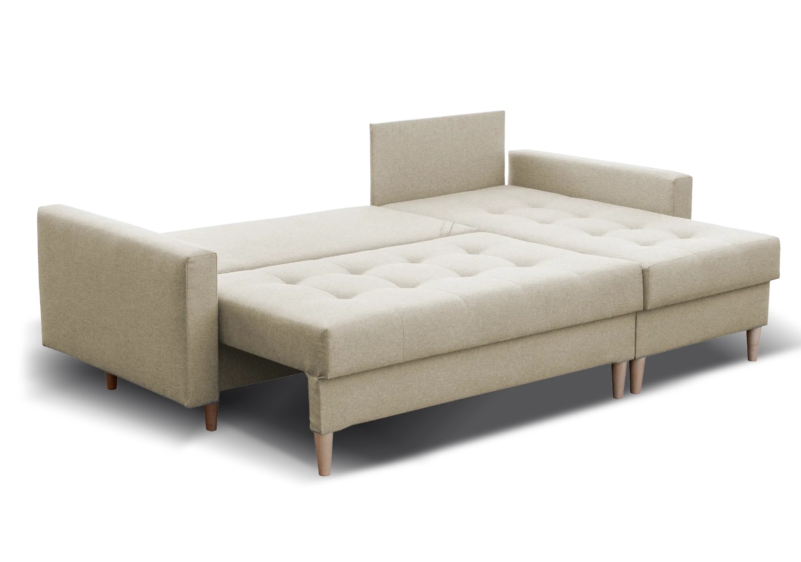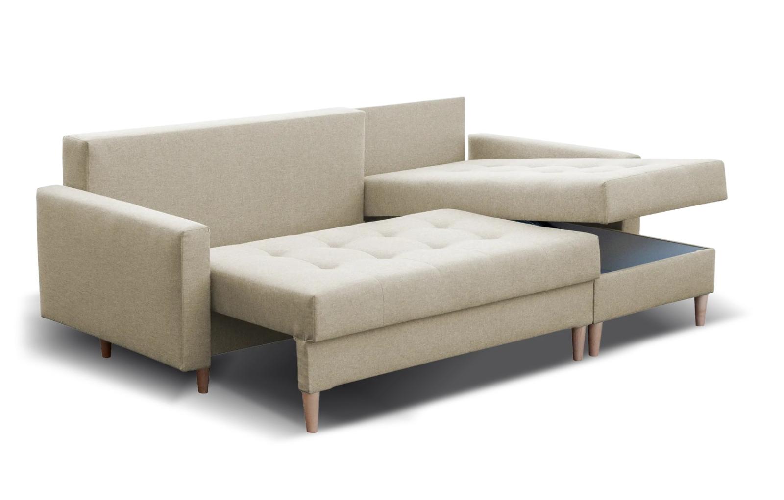 S rohovou sedací soupravou TRENTO získáte dokonalou kombinaci stylu a funkčnosti pro váš obývací pokoj. Dřevěné nohy dodávají soupravě elegantní a moderní vzhled, který se perfektně hodí k populárnímu skandinávskému stylu. Opěradlová část se skládá z polštářů, které jsou dvojitě prošívané. Sedací souprava se také může snadno přeměnit na pohodlné lůžko pro hosty nebo jako náhrada za klasickou postel v menším bytě. Díky úložnému prostoru pod sedákem, máte dostatek místa na uskladnění všech vašich věcí.