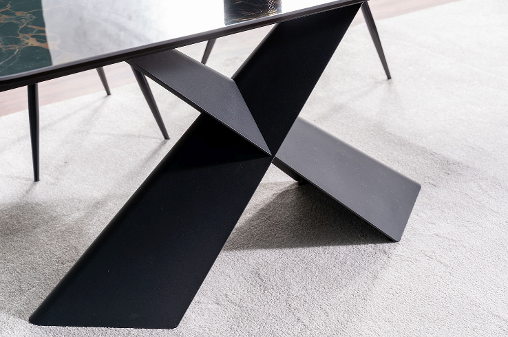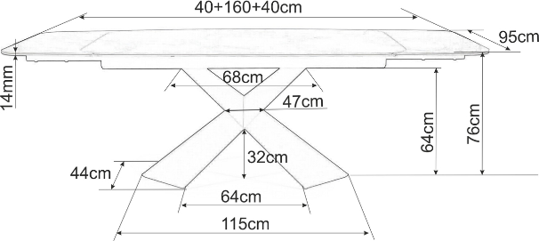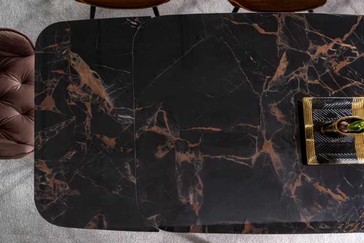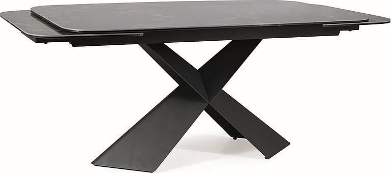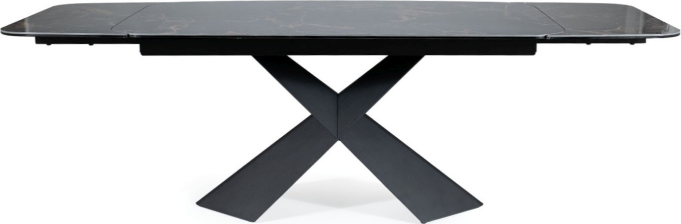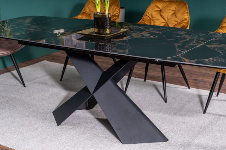 Jídelní stůl AURELIA II přináší moderní a nadčasový styl a je skvělou volbou především do interiérů ve stylu glamour a loft. Stolová deska je vyrobena tvrzeného skla a krásné keramiky Versace Black, díky které působí luxusním dojmem. Tvrzené sklo zajišťuje vysokou odolnost proti poškrábání a snadnou údržbu. Zaoblené hrany stolové desky kontrastují s kovovým podstavcem ve tvaru písmene X, který dodává stolu robustní a futuristický vzhled, který zaujme každého návštěvníka. Velkou předností je rozkládací mechanismus, díky kterému můžete stůl snadno a rychle zvětšit z původních 160 cm na 240 cm. Díky tomu ke stolu pohodlně usadíte až 10 osob