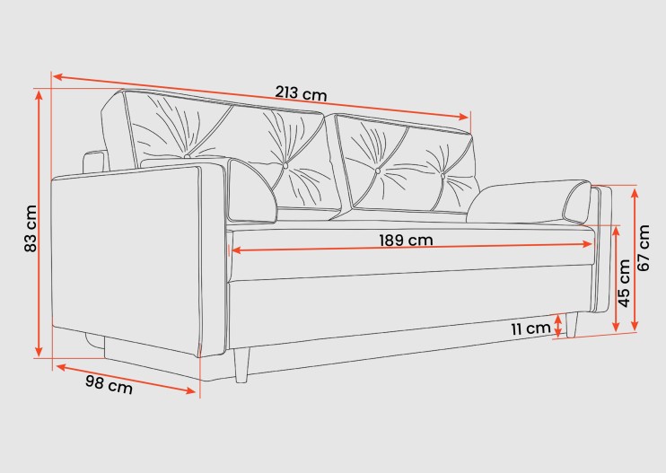 Rozkládací pohovka MONZA je elegantní kus nábytku, který se dokonale hodí do jakéhokoli interiéru. Měkké područky a polštáře zvyšují komfort používání. Pohovku snadno rozložíte. Má také praktický úložný prostor na lůžkoviny a zadní strana je potažena látkou, což umožňuje její umístění kdekoliv v místnosti.