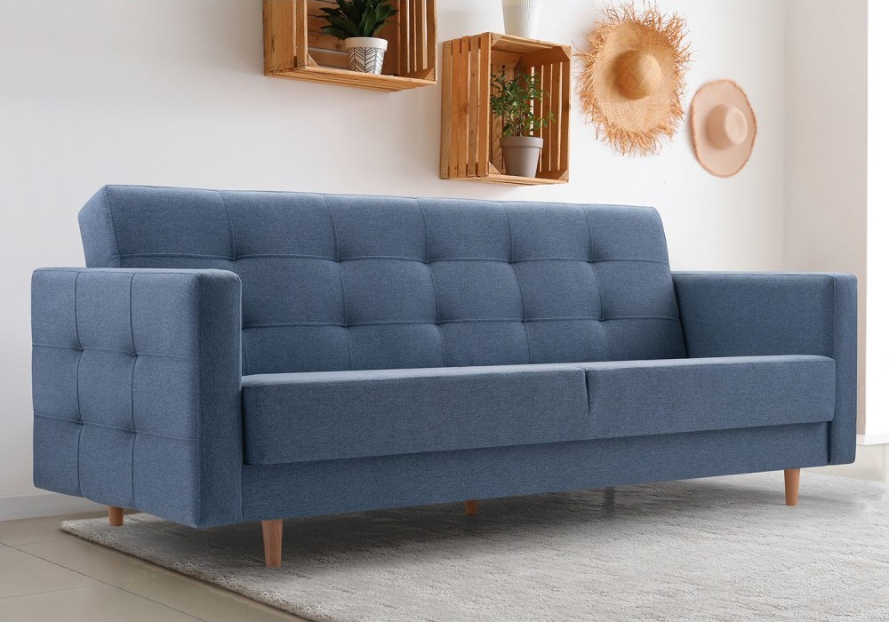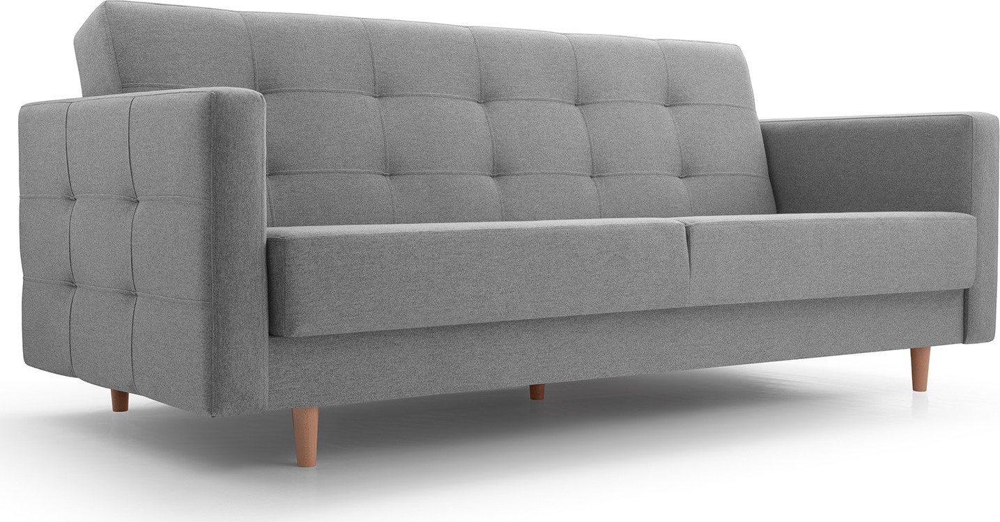 Rozkládací pohovka TERST skandinávského stylu, která se hodí do moderně zařízeného interiéru. Charakteristickým znakem pohovky jsou dřevěné nohy a prošívaní na opěradle a bocích. Vše je doplněno světlými dřevěnými nožkami. Pohovka má spací plochu 119x180 cm a úložný prostor na lůžkoviny.
