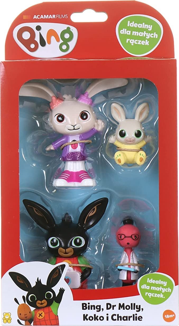 Sada plastových figurek inspirovaných animovaným dětským seriálem o králíčkovi Bingovi a jeho veselých kamarádech. Rozkošné figurky Binga, doktorky Molly, Coco a Charlieho jsou ideální pro dětské ručičky a lze je snadno uchopit, zvednout a umístit na různá místa. Malí fanoušci Bingových dobrodružství rádi tráví dlouhé hodiny hrou se zábavnými postavičkami, přehrávají si své oblíbené pohádkové příběhy nebo si vymýšlejí nová dobrodružství. Balení obsahuje 4 figurky o velikosti 7 až 9 cm. Vhodné pro děti od 18 měsíců.Vlastnosti