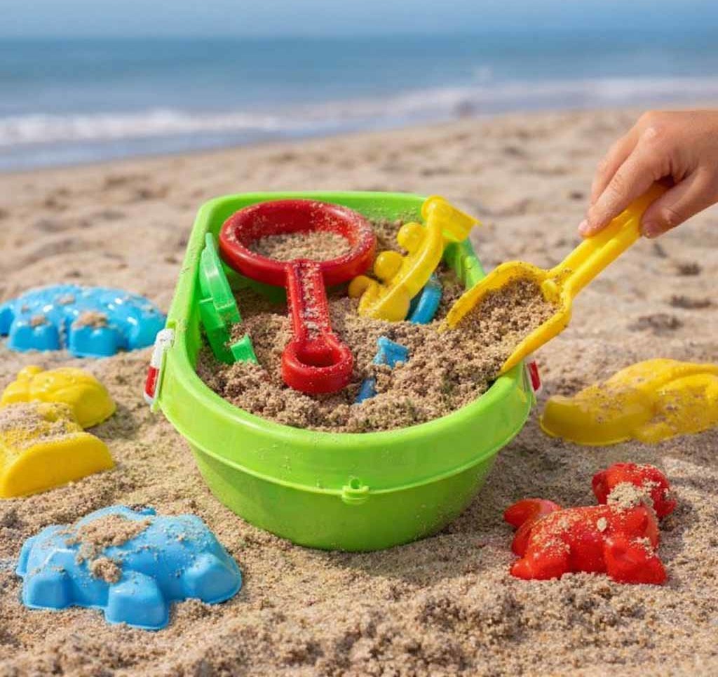 - Všestranné hraní venku – sada podporuje fyzickou aktivitu na zahradě, na pláži nebo v pískovišti a umožňuje dětem stavět hrady, prosévat písek, vytvářet vodní cesty a hrát si ve vodě.