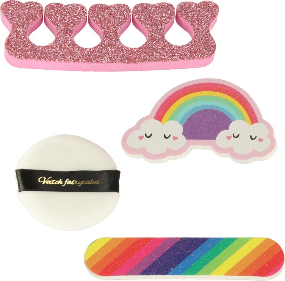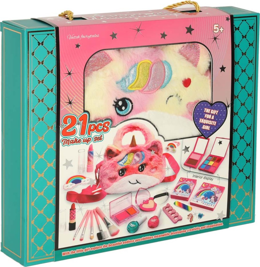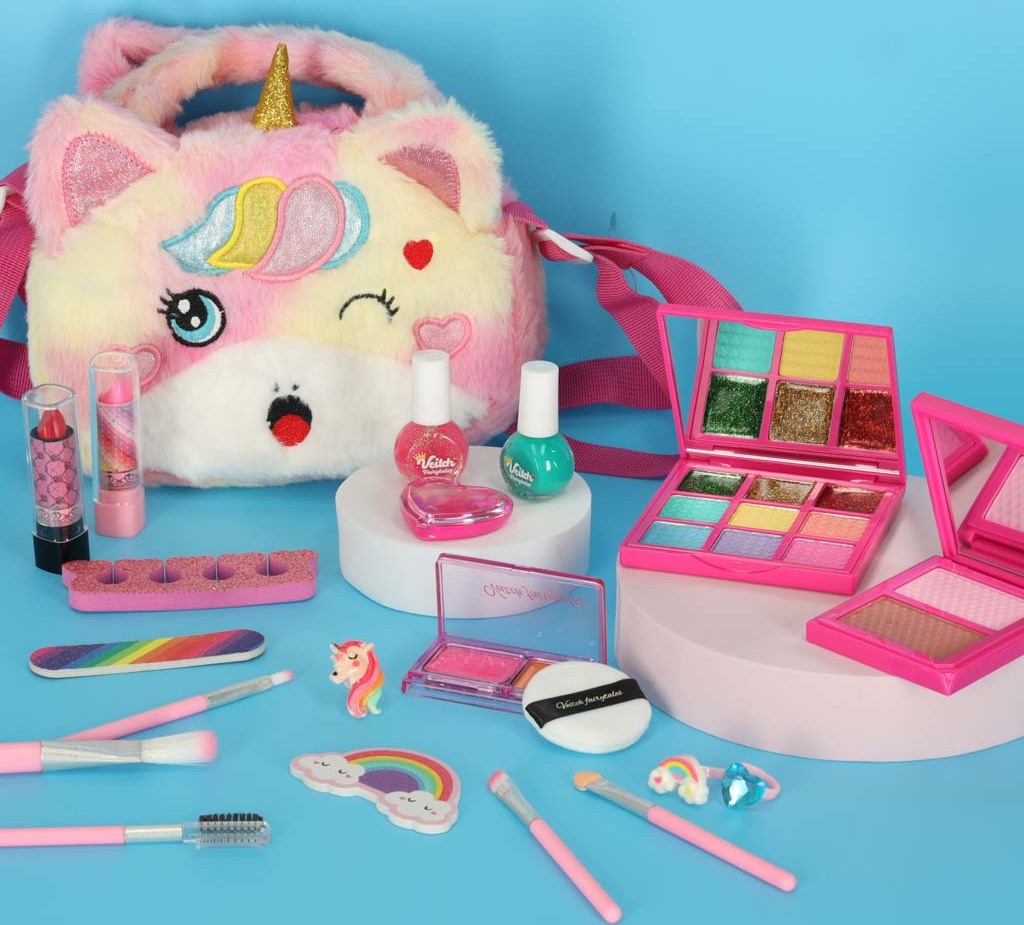 Barevné stylingové a make-upové doplňky jsou zábavným způsobem, jak si kreativně pohrát s módou a krásou. Tato taštička s jednorožcem plná kosmetických pokladů obsahuje produkty na líčení, doplňky na nehty, štětce a houbičky na líčení a stylové prsteny.