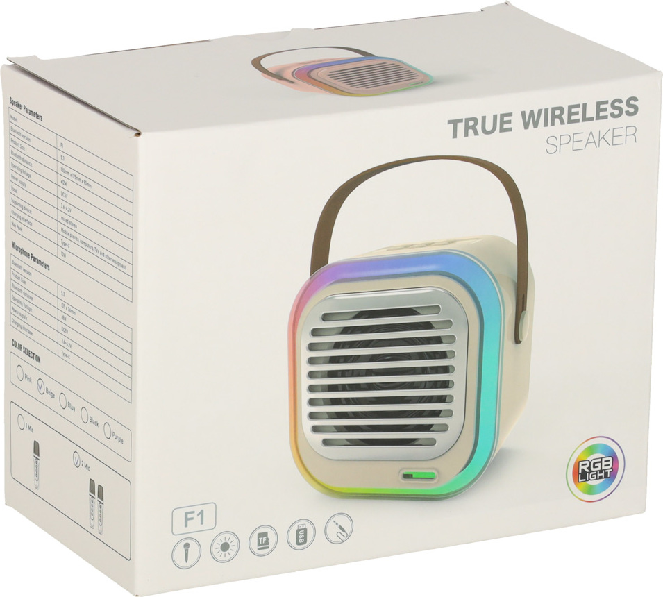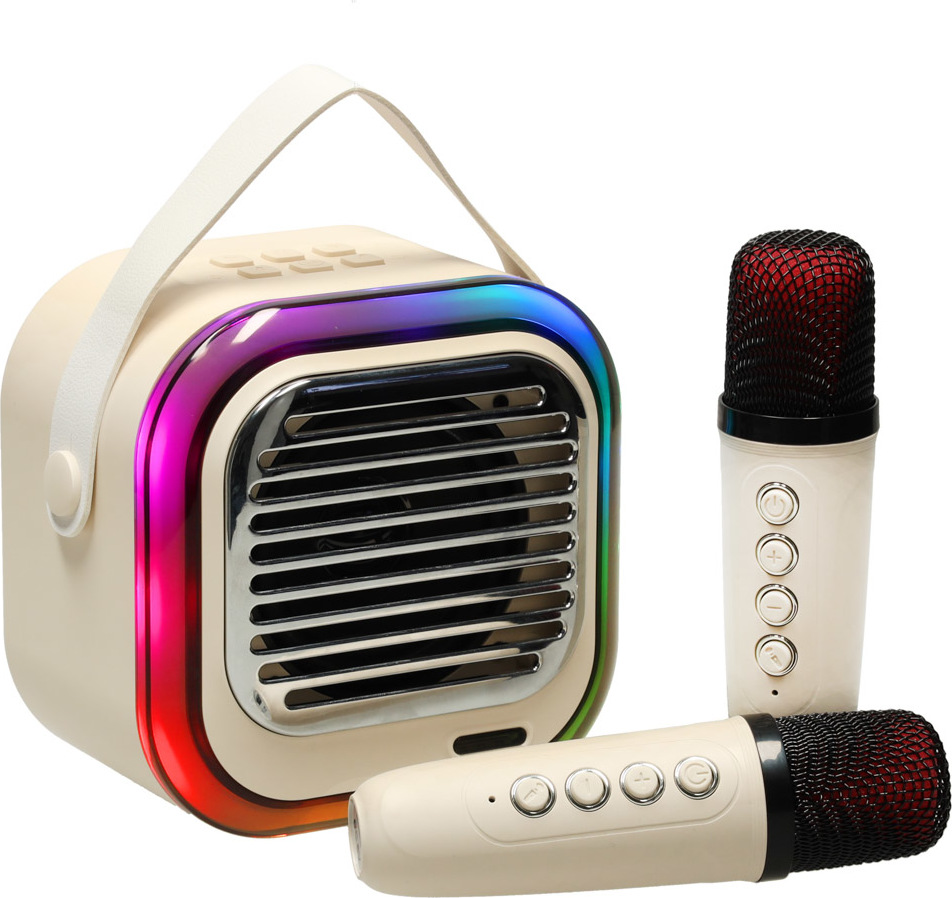 Krémový karaoke reproduktor je zařízení s podporou Bluetooth a RGB osvětlením, které dětem umožňuje přehrávat hudbu a zpívat si s nimi své oblíbené písně. Reproduktor je vybaven tlačítky pro přepínání skladeb a nastavení hlasitosti. Hudbu lze přehrávat připojením reproduktoru k telefonu nebo pomocí paměťové karty (není součástí balení). Sada obsahuje dva mikrofony pro zpěv s hudbou přehrávanou přes reproduktor. Mají také funkci úpravy hlasu, která vylepšuje dětské vystoupení. Zařízení jsou napájena vestavěnými bateriemi, které se nabíjejí přes USB (kabel je součástí balení).