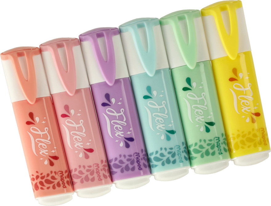 Zvýrazňovače Flex Pastel - jedinečný měkký hrot vyrobený japonskou technologií dokonale přilne ke zvýrazňovanému povrchu, a to i k takovému, který není dokonale rovný.