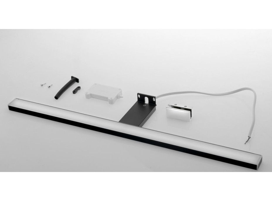 Moderní svítidlo bez LED driveru, připojuje se přímo na 230V pomocí spojovacího boxu s ochranou IP44. Montáž na zeď nebo na rám zrcadla. Součástí balení je univerzální držák v chromu, pomocí kterého lze instalovat svítidlo na galerku nebo přímo na zrcadlo (max. tloušťka zrcadla je 6 mm).