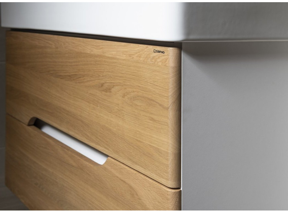 Série MEDIENA je kombinací bílé matné barvy a zásuvek z masivního dřeva, které svým zaoblením kopírují tvar keramických umyvadel SAND od italského výrobce GSI. Zásuvky s netradičním tvarem výřezu pro otvírání jsou vybaveny výsuvy BLUM s funkcí tlumení BLUMOTION s doživotní zárukou. Skříňky nabízíme buď celé v bílém matném provedení nebo v kombinaci korpus matná bílá a čela zásuvek ve 2 dekorech dubového dřeva (voskový olej dub natural a dub graphite). Šířky skříněk jsou 60, 80, 100 a 120 cm. V nabídce jsou též 2 typy doplňkových policových skříněk. Skříňku s prádelním košem získáte jednoduchým vyjmutím spodní police u doplňkové skříňky šíře 35 cm a instalací látkového prádelního koše na suchý zip.