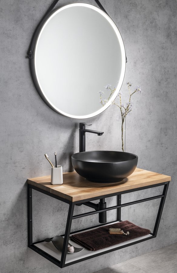 - Konstrukce pod umyvadlo, s bílou policí z lakované MDF desky.
