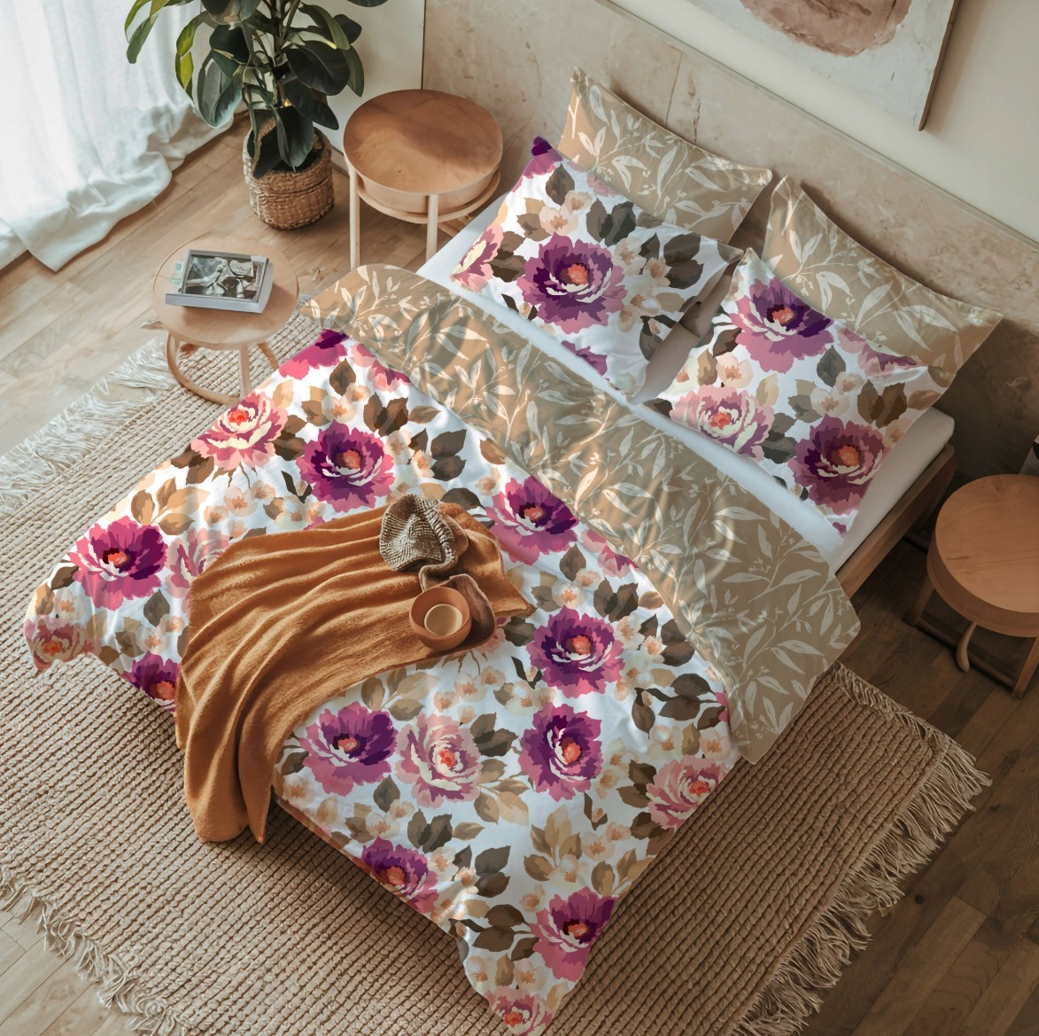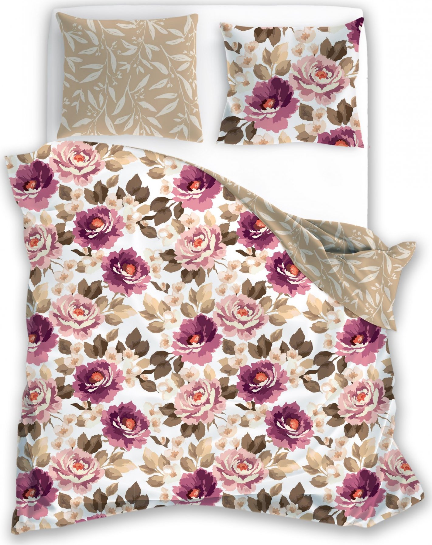 Saténové povlečení MILAGRO VERDE Fialové květy - bílé/béžové - 140x200 cm