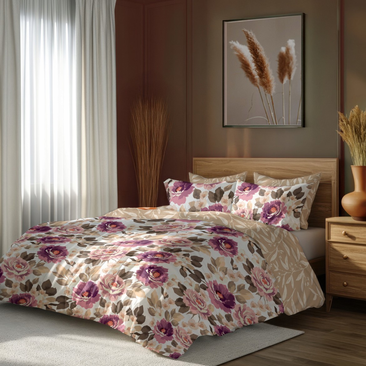 Saténové povlečení MILAGRO VERDE Fialové květy - bílé/béžové - 220x200 cm