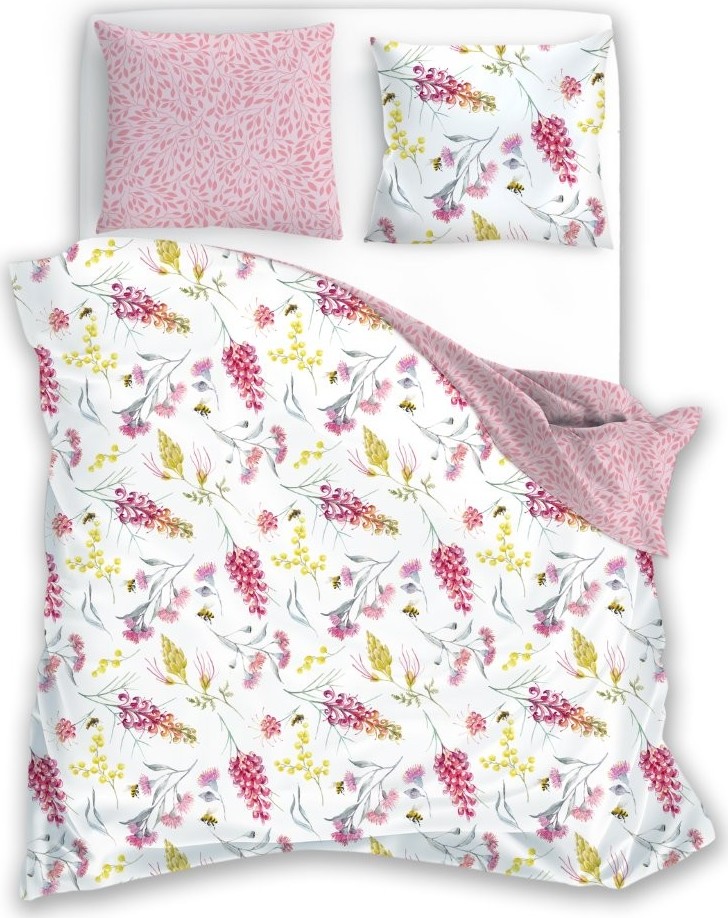 Saténové povlečení MILAGRO VERDE Květy a včelky - bílé/růžové - 140x200 cm