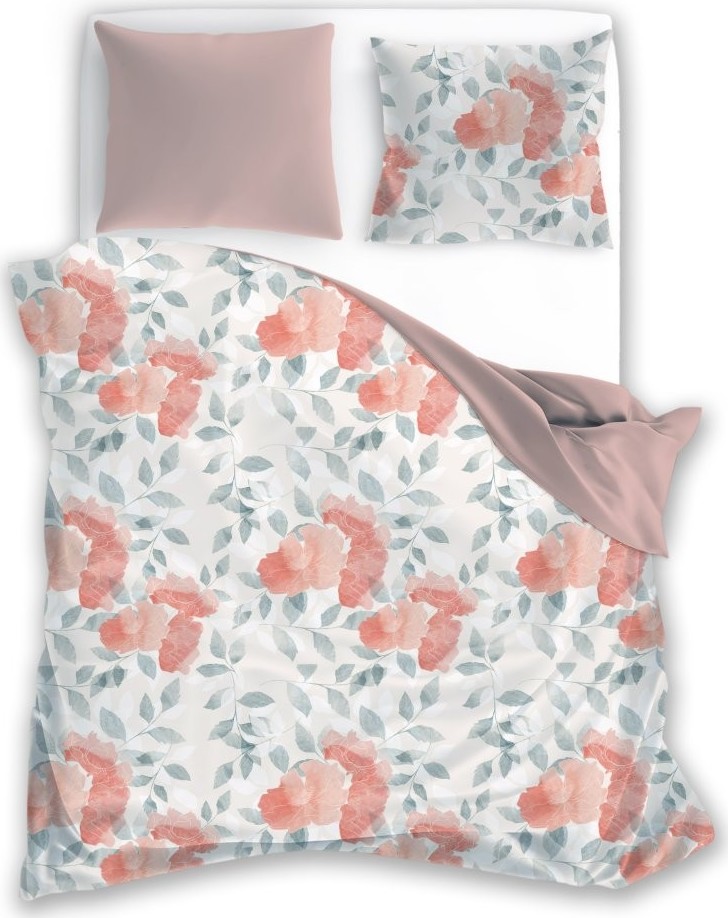 Saténové povlečení MILAGRO VERDE Růžové květy - bílé/růžové - 160x200 cm