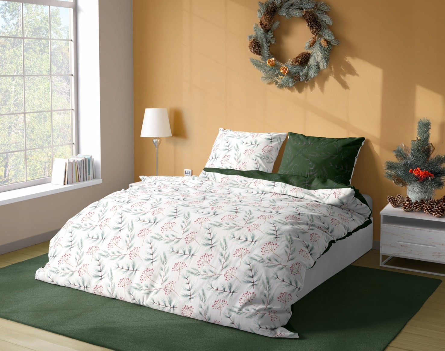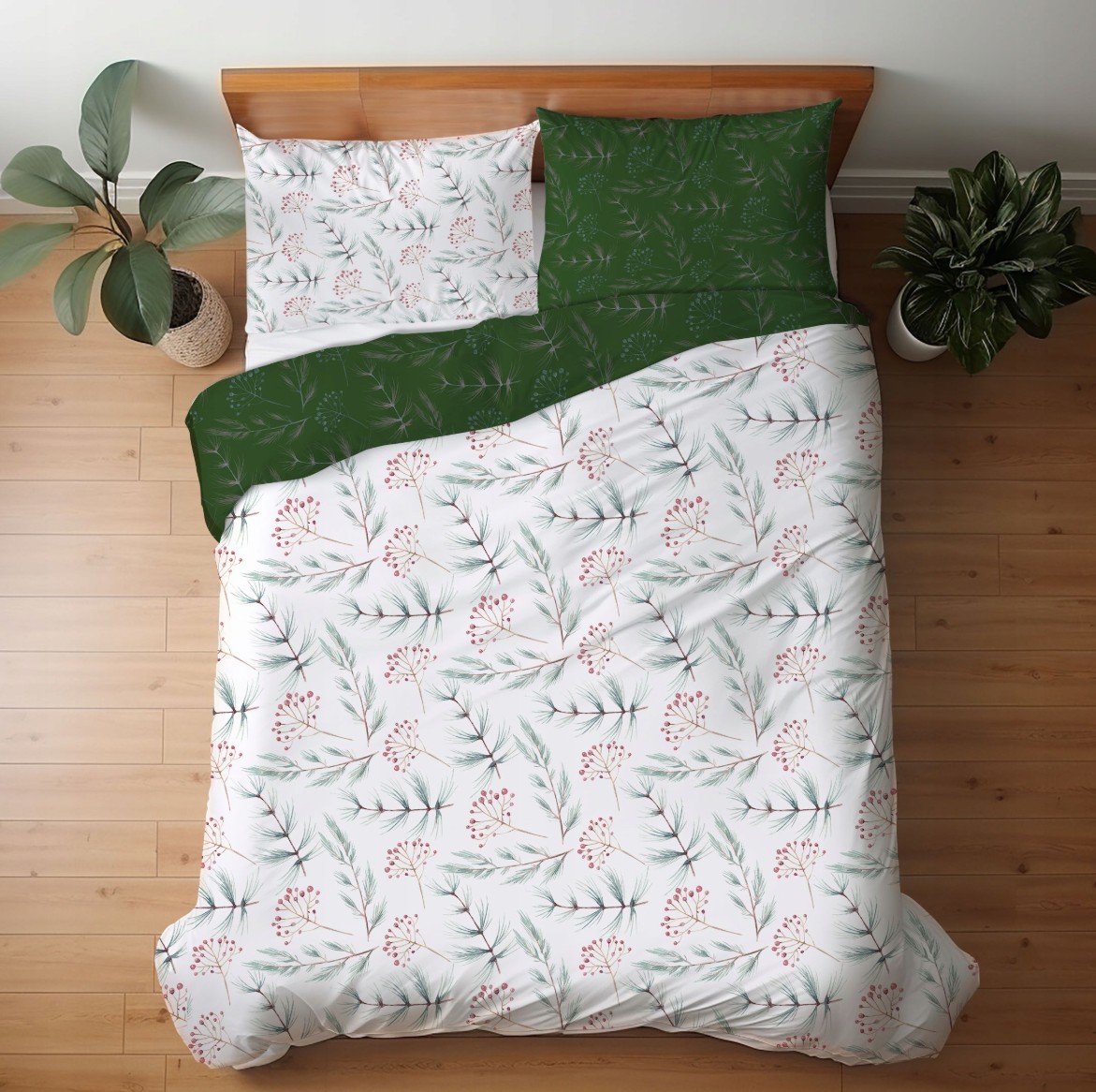 Saténové povlečení MILAGRO VERDE Zimní větvičky - bílé/zelené - 140x200 cm