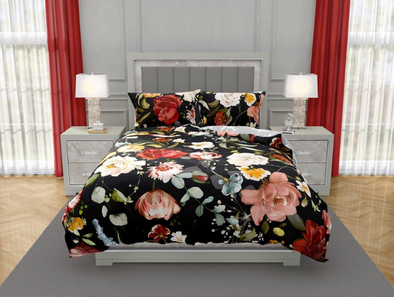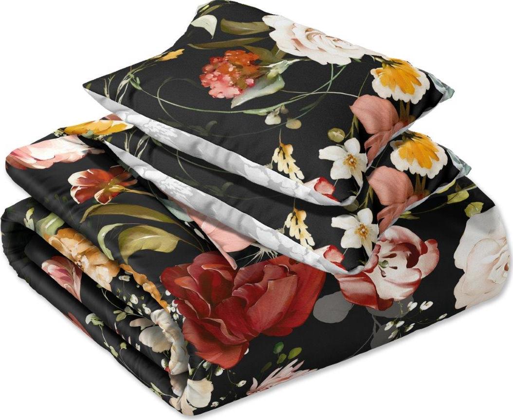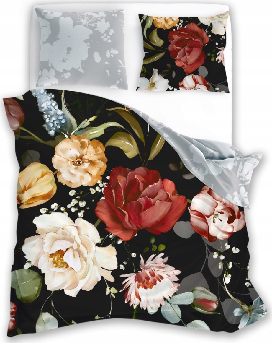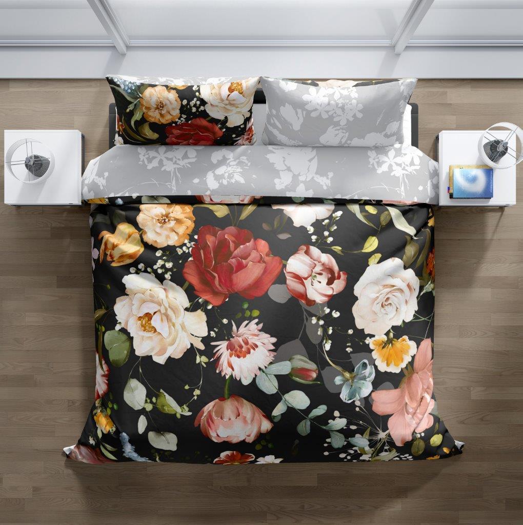 Saténové povlečení NOBILE Květy - černé/šedé - 160x200 cm