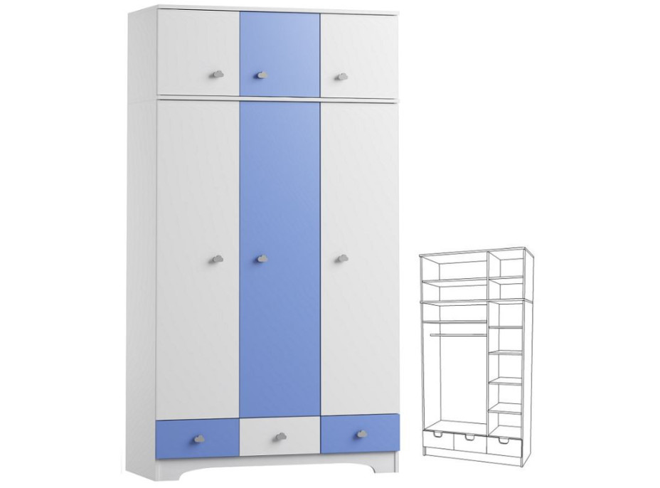 Prostorná šatní skříň s nástavcem CLOUDS se vyznačuje vysokou kvalitou zpracování, kterou zajišťují kvalitní lamino desky o síle 18 mm. Hrany nábytku jsou opatřeny ABS/PVC materiálem, který jej chrání před mechanickým poškozením a vlhkostí. Barvu skříně můžete vybírat z naší bohaté nabídky podle vašich představ. Skříň je rozdělena do dvou částí - levá strana obsahuje polici a šatní tyč po celé šířce, pravá strana je rozdělena policemi. Další úložný prostor poskytují šuplíky ve spodní části skříně a nástavec s policí rozdělený na dvě části. Získáte tak velké množství úložných prostor pro oblečení a doplňky. Dvířka i čela šuplíků jsou osazená plastovými úchyty ve tvaru mráčků, charakteristickými pro celou kolekci. Úchyty dodávají nábytku jedinečný charakter a styl. Šatní skříň CLOUDS skvěle doplní nábytek z této kolekce a vy tak můžete vytvořit kombinaci přesně podle potřeb vašeho dítěte nebo mladého studenta.