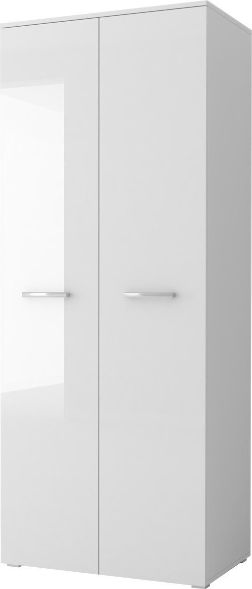 Dvoudveřová šatní skříň FABIO je ideální volbou pro ty, kteří hledají stylovou a praktickou šatní skříň, která se skvěle hodí jak do moderních, tak klasických interiérů. Vnitřek skříně obsahuje šatní tyč a polici, což poskytuje dostatek úložného prostoru pro zavěšení vašich šatů a uložení dalších věcí. Dvířka v bílém lesku se otevírají pomocí úchytek z PVC. Skříň je vyrobena z kvalitní laminované desky o tloušťce 16 mm. Hrany jsou zakončeny ABS lištou, což zajišťuje jejich odolnost a pevnost.