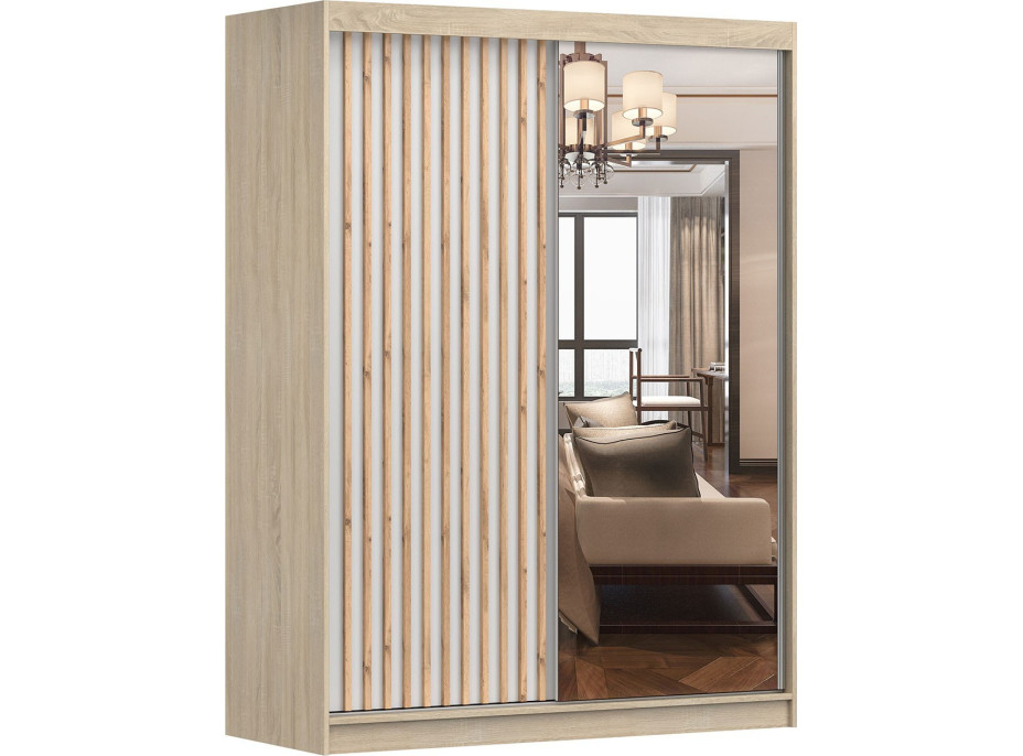 LAMBDA 150 je moderní skříň s posuvnými dveřmi v zajímavých barevných kombinacích, která se hodí do mnoha interiérů. Systém posuvných dveří šetří místo v místnosti a zjednodušuje otevírání a zavírání. Dveře s úchytkami z hliníku se posouvají na kolečkách s kuličkovými ložisky, které zajišťují hladký a tichý pohyb. Na přední straně dveří jsou ozdobné lamely z MDF v barvě dřeva. Zrcadlo přes celou plochu druhých dveřích rozjasní a opticky zvětší místnost. Skříň je rozdělena na dvě části, které jsou vybaveny nejen prostornými policemi a závěsnou tyčí, ale také dostatečným prostorem pro uložení velkého množství oblečení, což z ní dělá praktickou volbu pro každou domácnost.