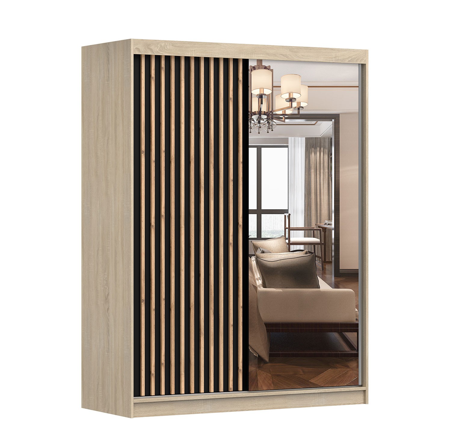 LAMBDA 150 III je moderní skříň s posuvnými dveřmi v zajímavých barevných kombinacích, která se hodí do mnoha interiérů. Systém posuvných dveří šetří místo v místnosti a zjednodušuje otevírání a zavírání. Dveře s úchytkami z hliníku se posouvají na kolečkách s kuličkovými ložisky, které zajišťují hladký a tichý pohyb. Na přední straně dveří v dekoru dubu sonoma jsou ozdobné černé lamely z MDF. Zrcadlo přes celou plochu druhých dveřích rozjasní a opticky zvětší místnost. Skříň je rozdělena na dvě části, které jsou vybaveny nejen prostornými policemi a závěsnou tyčí, ale také dostatečným prostorem pro uložení velkého množství oblečení, což z ní dělá praktickou volbu pro každou domácnost.
