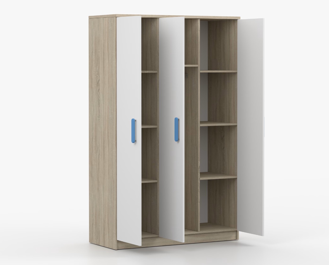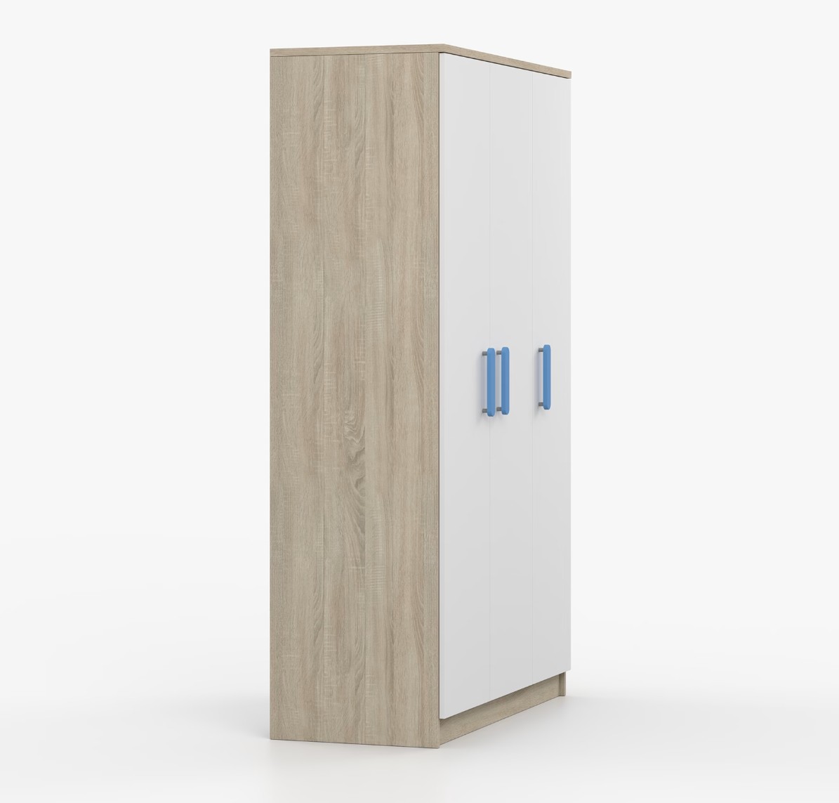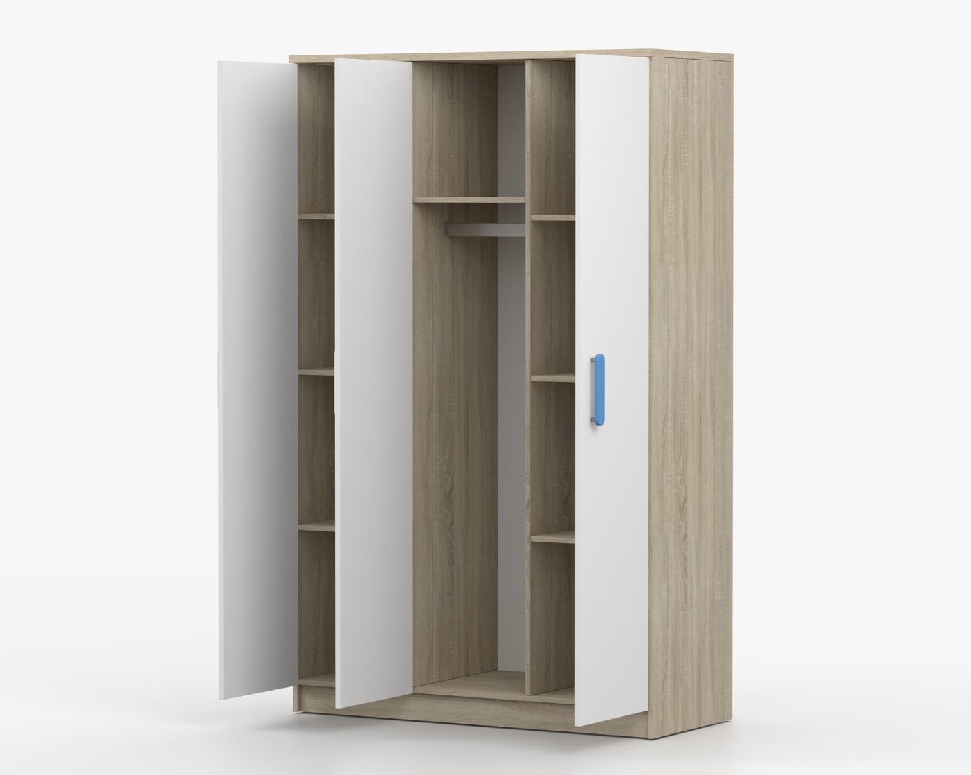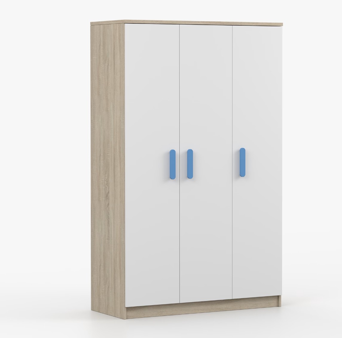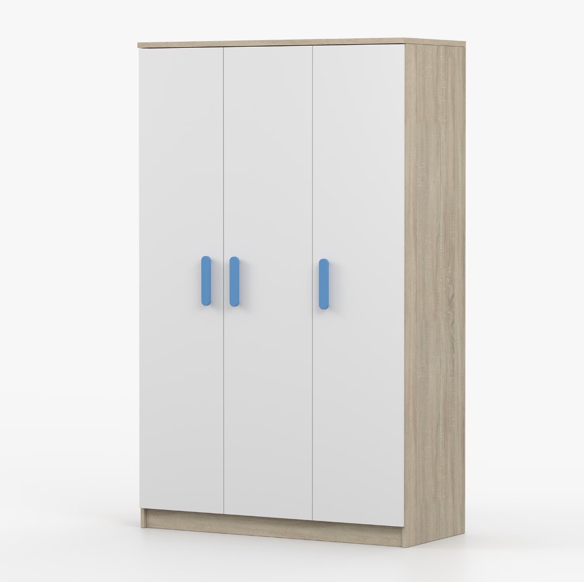 Třídveřová šatní skříň SCOUT se vyznačuje praktickým úložným prostorem a velkou kapacitou. S jednoduchým a moderním designem se skříň SCOUT hodí do každého typu domácnosti - ať už jde o dětský pokoj nebo studentův byt. Skříň je vyrobena z kvalitní laminované desky o tloušťce 16 mm s odolnými ABS hranami, které ji chrání před mechanickým poškozením. Šatní skříň poskytuje velký úložný prostor s dostatečným množstvím polic i místo na pověšení oblečení. Dveře jsou opatřené dřevěnými barevnými úchytkami a otevírají se tradičním způsobem.