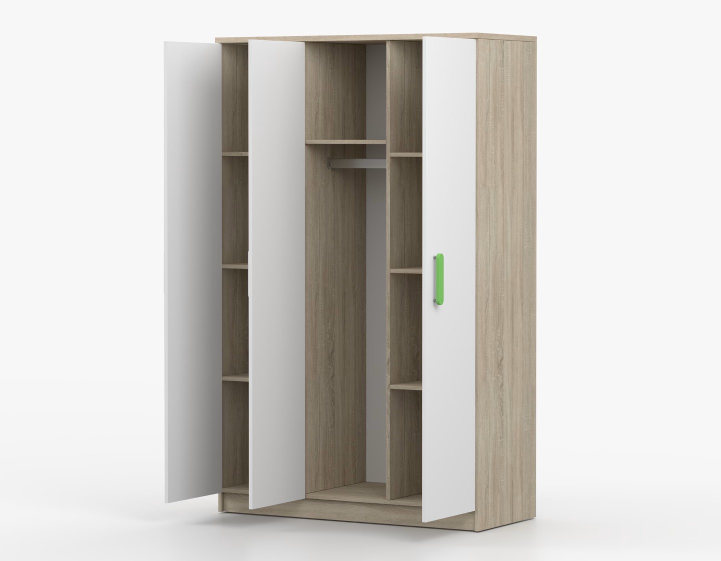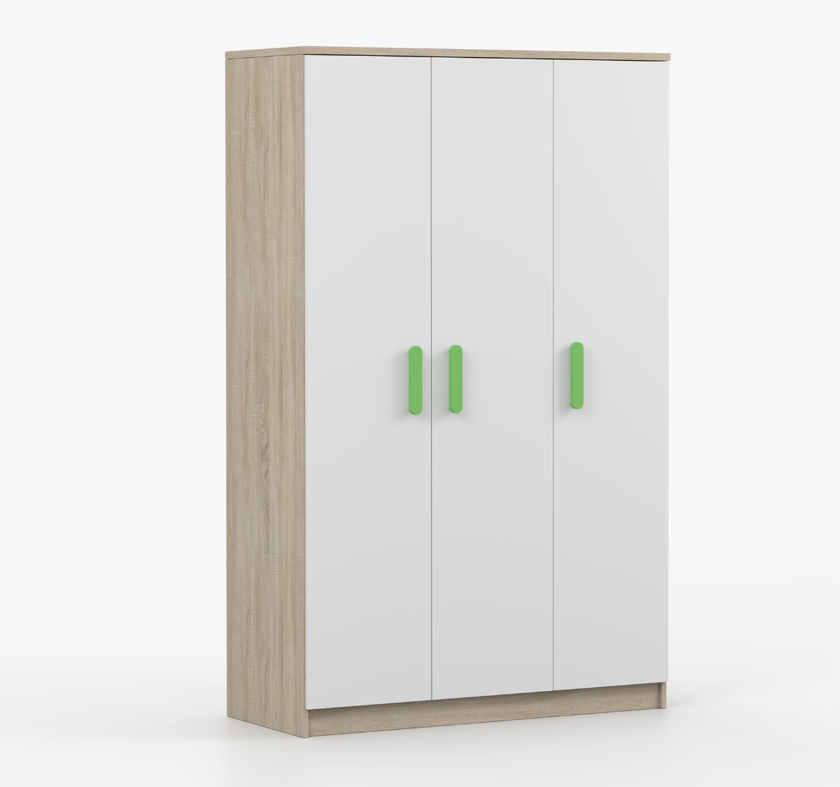 Třídveřová šatní skříň SCOUT se vyznačuje praktickým úložným prostorem a velkou kapacitou. S jednoduchým a moderním designem se skříň SCOUT hodí do každého typu domácnosti - ať už jde o dětský pokoj nebo studentův byt. Skříň je vyrobena z kvalitní laminované desky o tloušťce 16 mm s odolnými ABS hranami, které ji chrání před mechanickým poškozením. Šatní skříň poskytuje velký úložný prostor s dostatečným množstvím polic i místo na pověšení oblečení. Dveře jsou opatřené dřevěnými barevnými úchytkami a otevírají se tradičním způsobem.