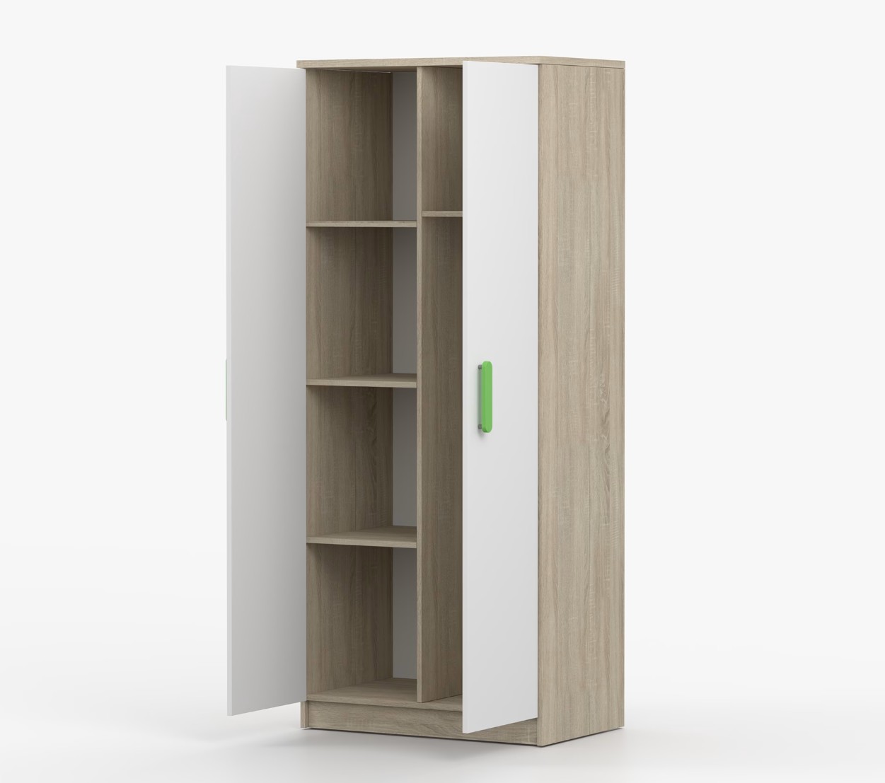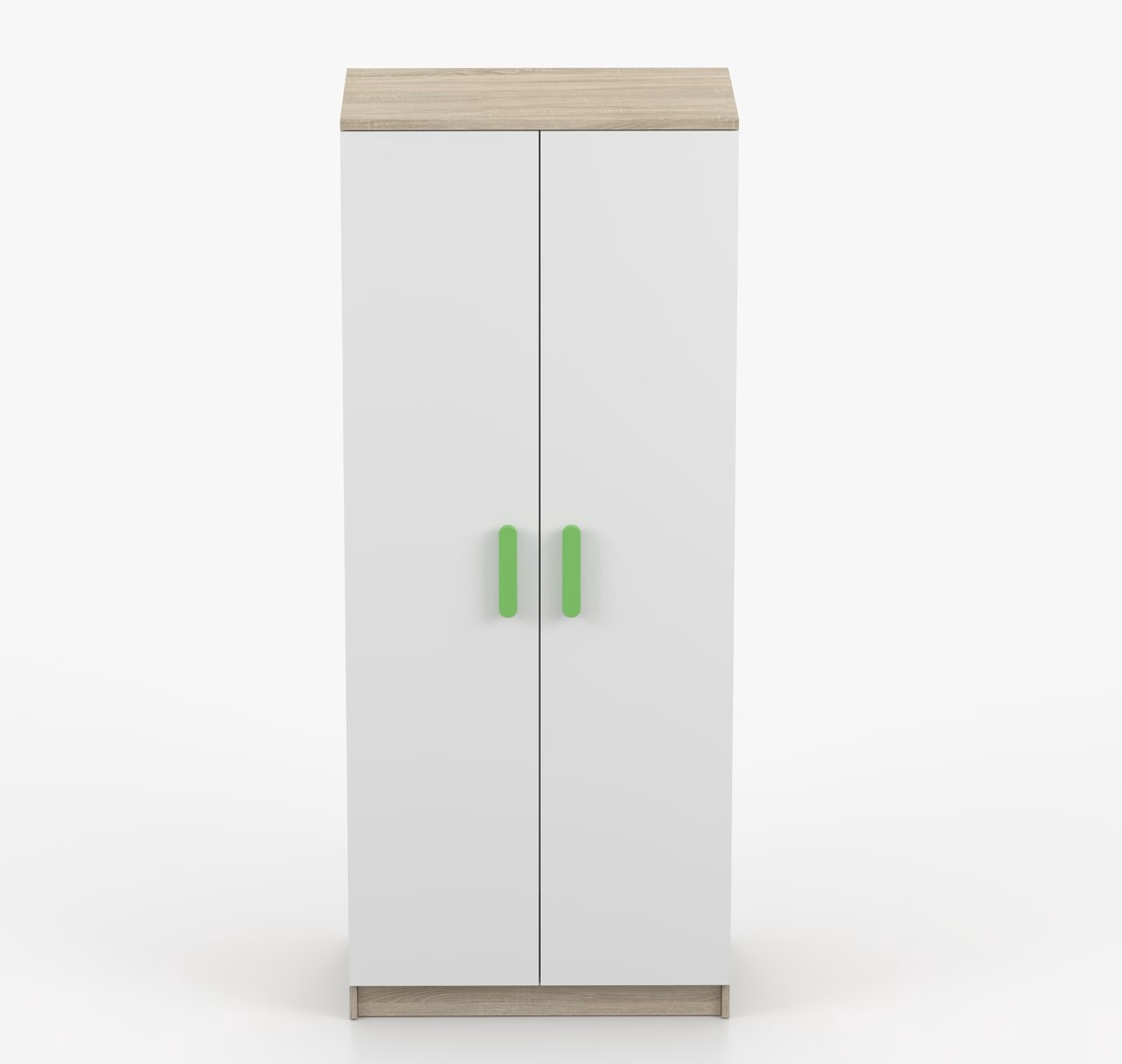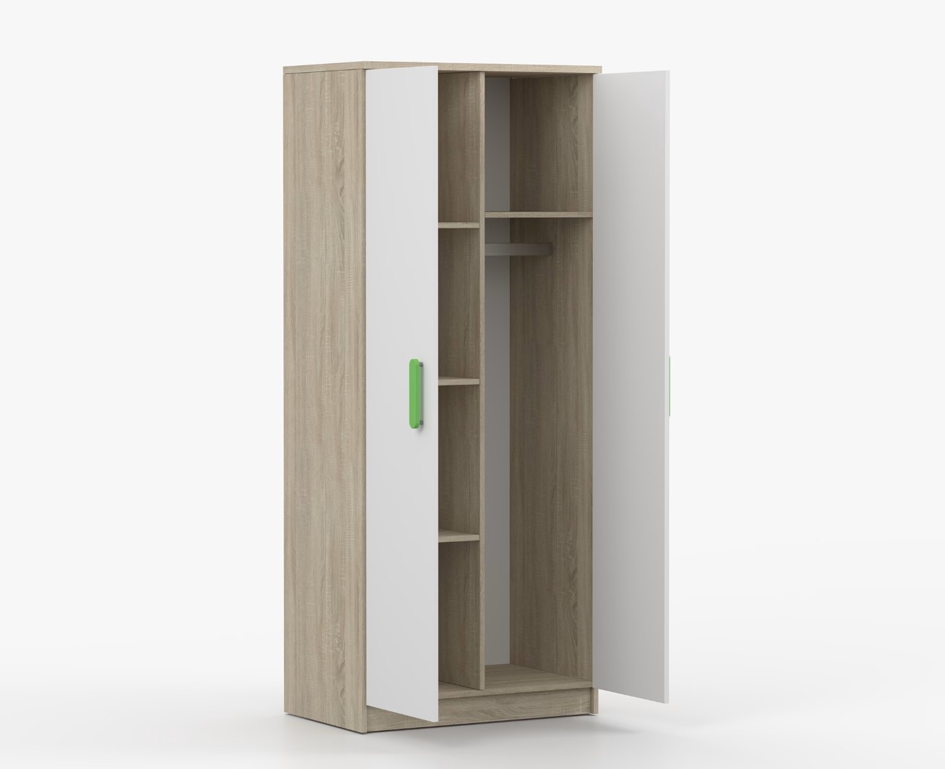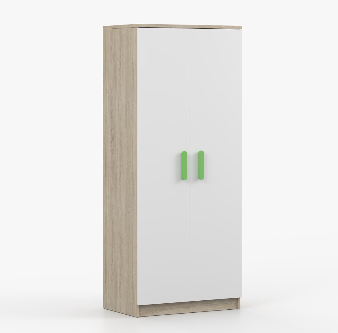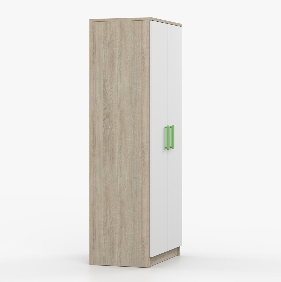 Dvoudveřová šatní skříň SCOUT s jednoduchým a moderním designem se hodí do každého typu domácnosti - ať už jde o dětský pokoj nebo studentův byt. Skříň je vyrobena z kvalitní laminované desky o tloušťce 16 mm s odolnými ABS hranami, které ji chrání před mechanickým poškozením. Šatní skříň poskytuje velký úložný prostor s dostatečným množstvím polic i místo na pověšení oblečení. Dveře jsou opatřené dřevěnými barevnými úchytkami a otevírají se tradičním způsobem.