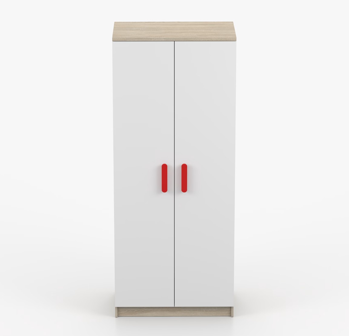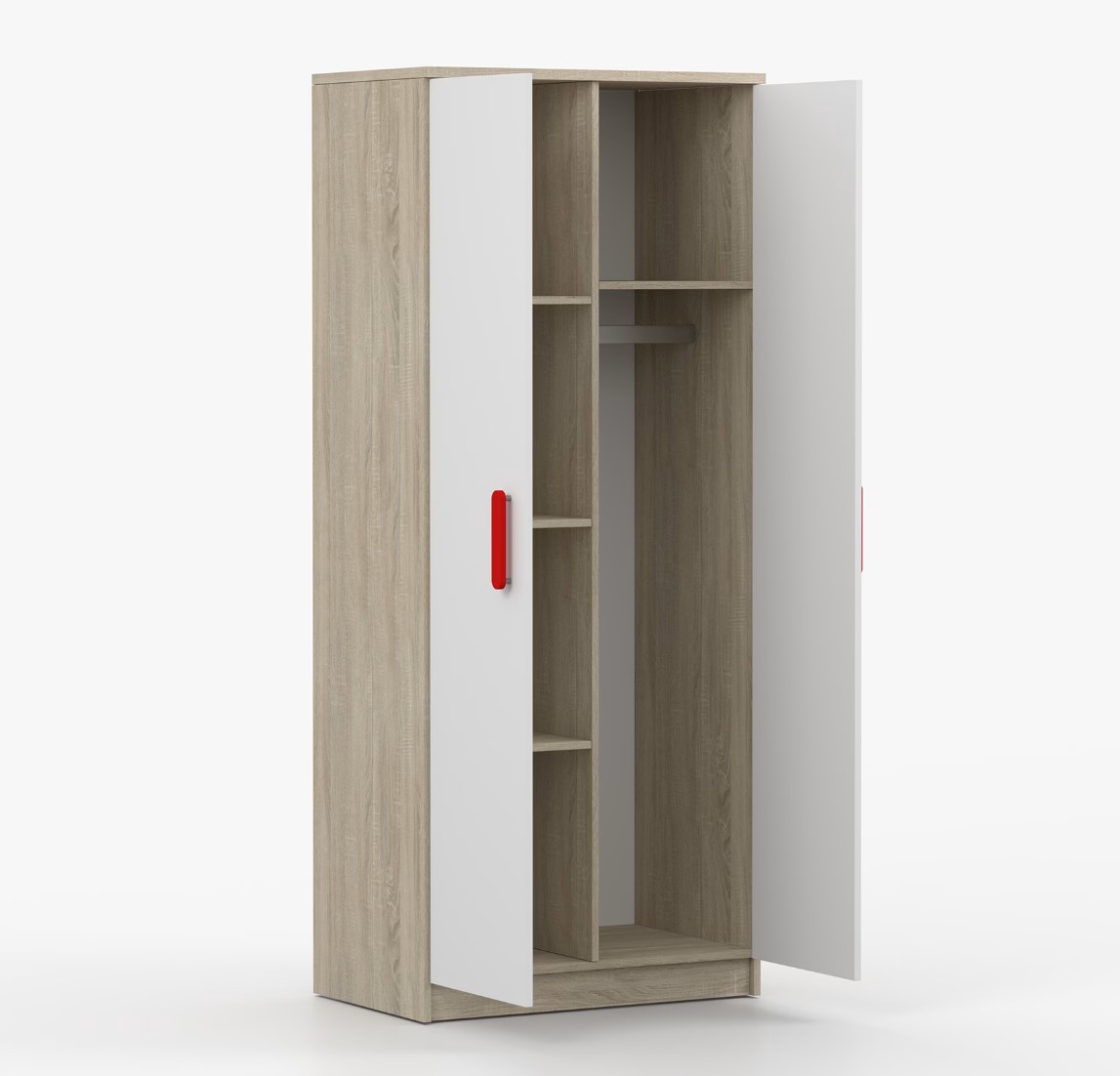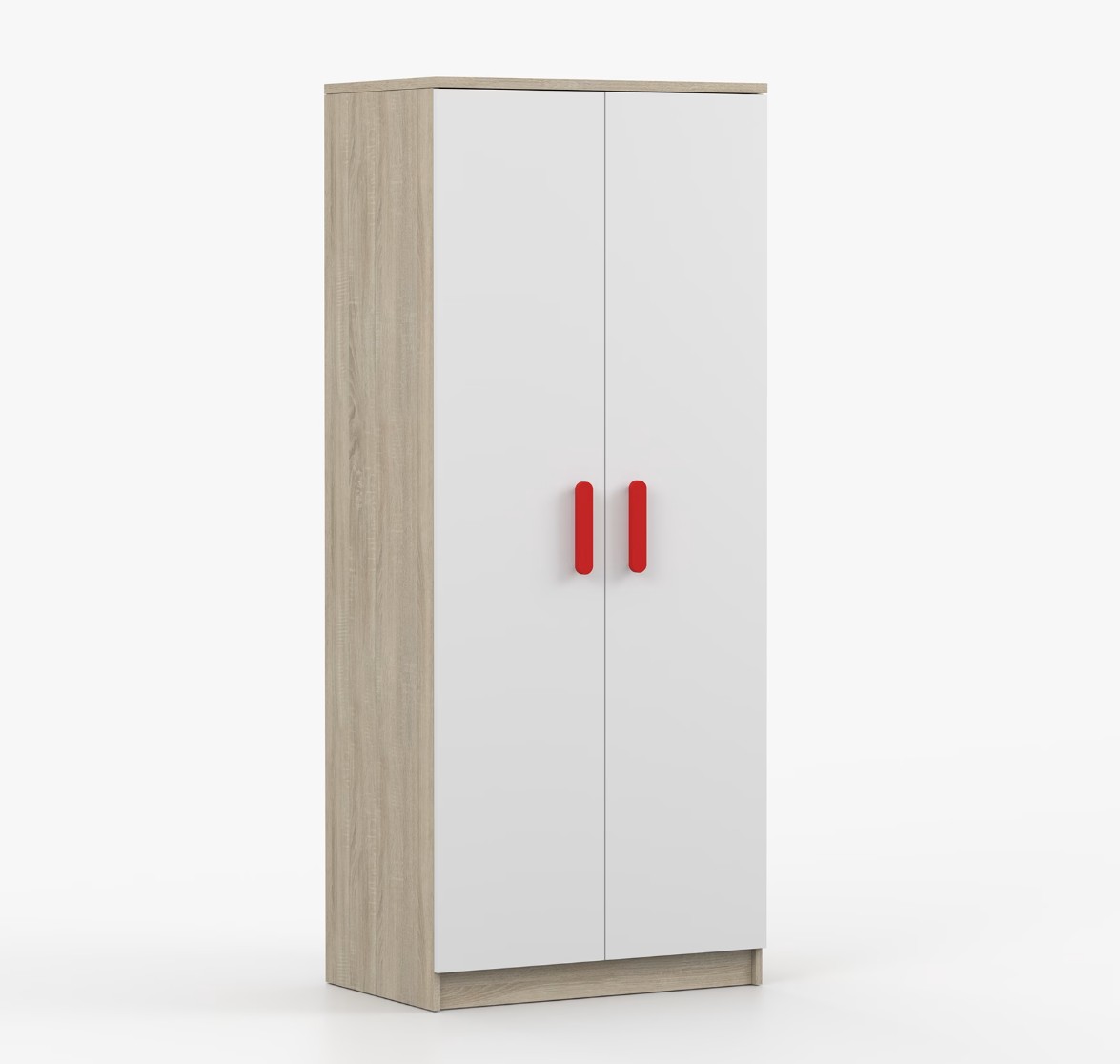 Dvoudveřová šatní skříň SCOUT s jednoduchým a moderním designem se hodí do každého typu domácnosti - ať už jde o dětský pokoj nebo studentův byt. Skříň je vyrobena z kvalitní laminované desky o tloušťce 16 mm s odolnými ABS hranami, které ji chrání před mechanickým poškozením. Šatní skříň poskytuje velký úložný prostor s dostatečným množstvím polic i místo na pověšení oblečení. Dveře jsou opatřené dřevěnými barevnými úchytkami a otevírají se tradičním způsobem.
