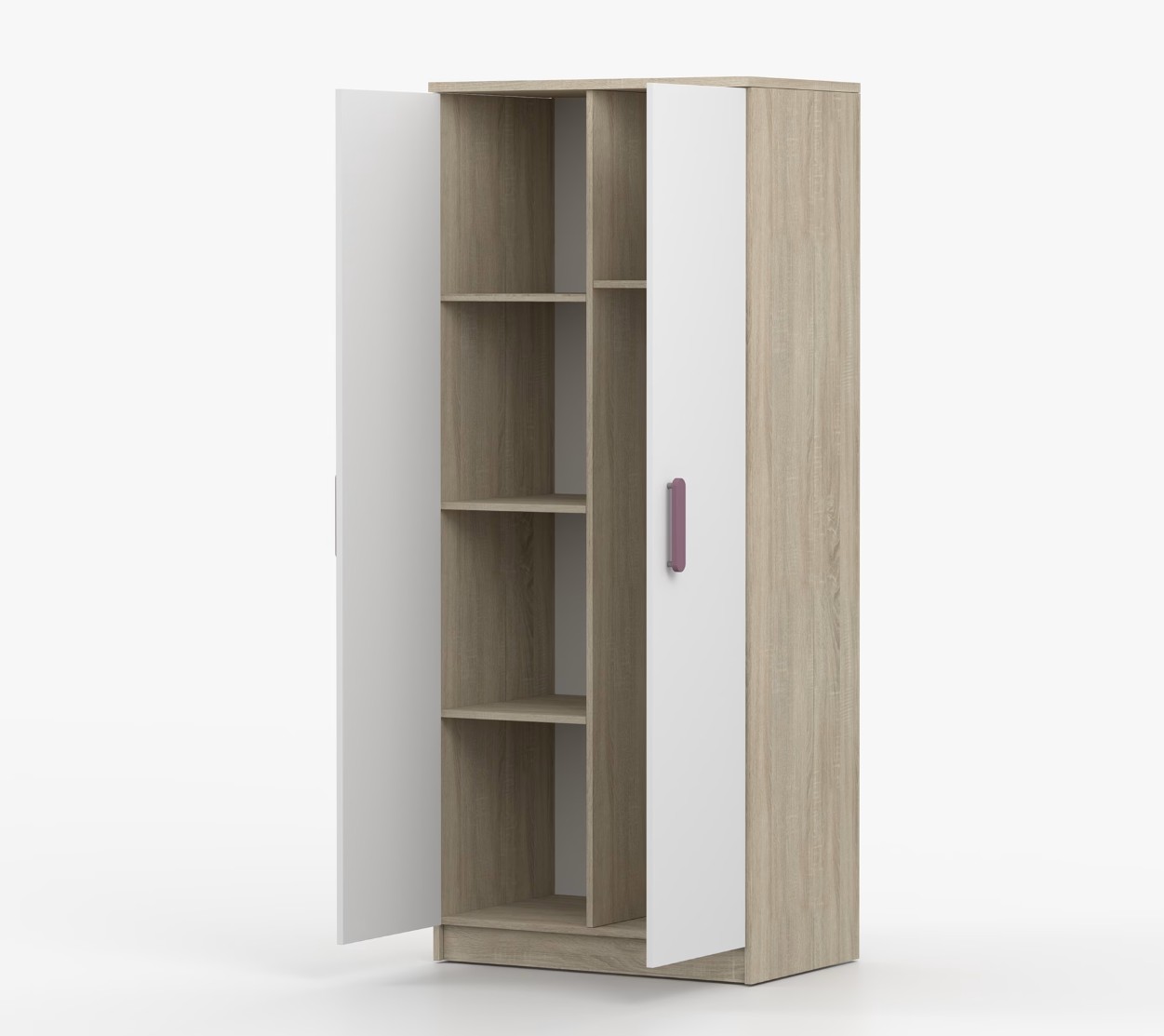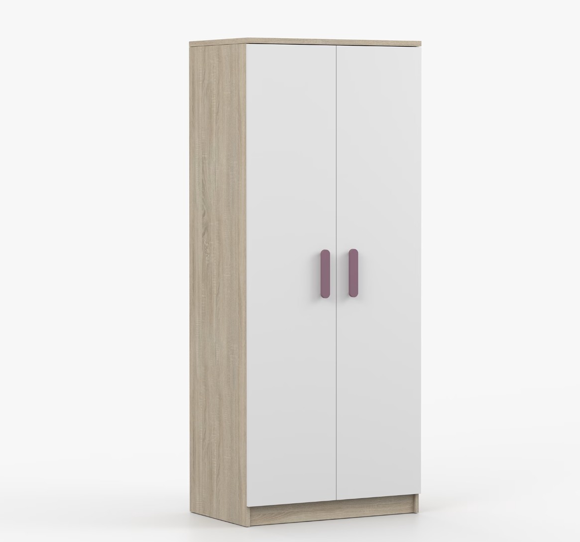 Dvoudveřová šatní skříň SCOUT s jednoduchým a moderním designem se hodí do každého typu domácnosti - ať už jde o dětský pokoj nebo studentův byt. Skříň je vyrobena z kvalitní laminované desky o tloušťce 16 mm s odolnými ABS hranami, které ji chrání před mechanickým poškozením. Šatní skříň poskytuje velký úložný prostor s dostatečným množstvím polic i místo na pověšení oblečení. Dveře jsou opatřené dřevěnými barevnými úchytkami a otevírají se tradičním způsobem.